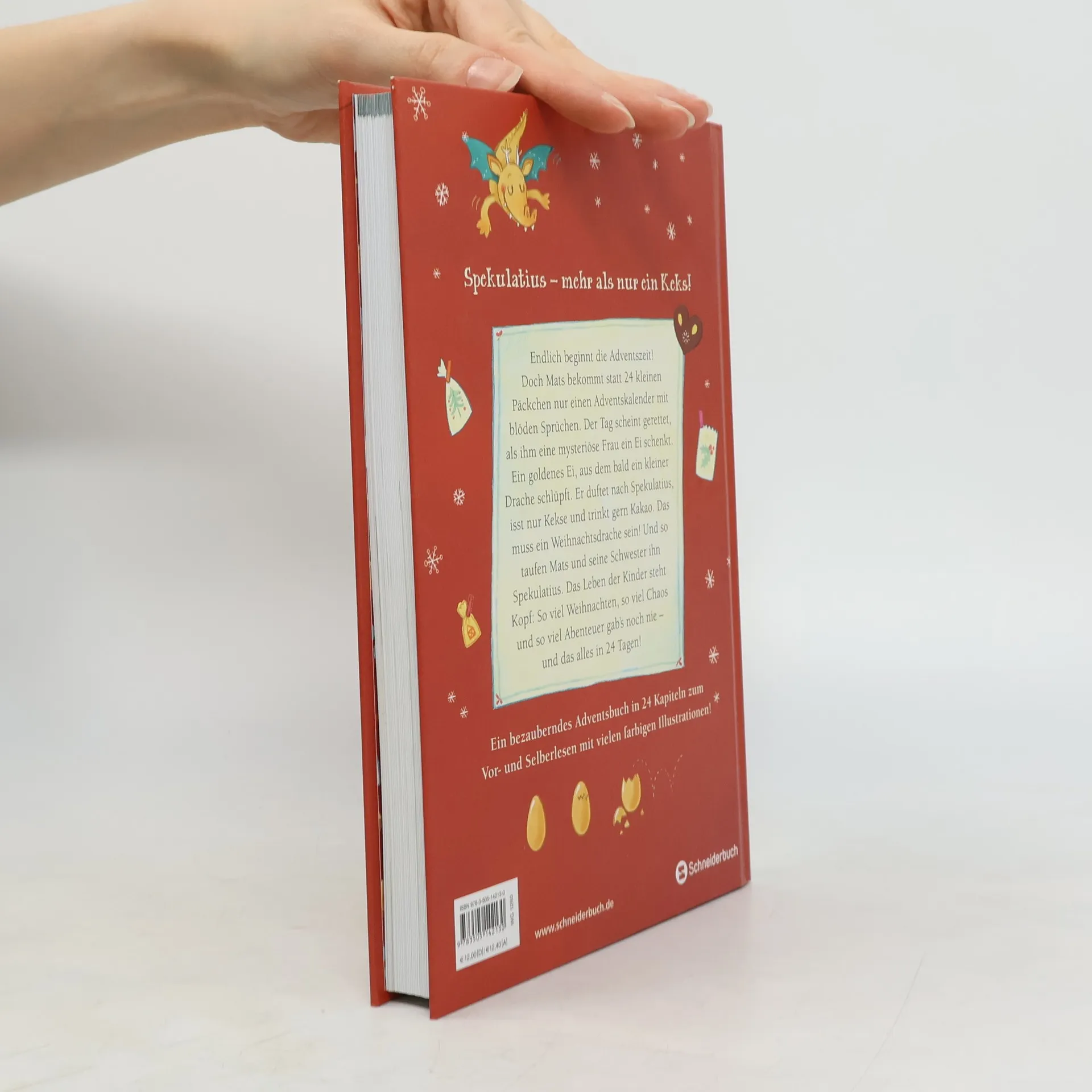 Spekulatius ist mehr als nur ein Keks! Für Mats ist der Start in den Dezember ziemlich ungewöhnlich. Er bekommt statt einer Schnur mit 24 kleinen Päckchen nur einen Adventskalender mit blöden Sprüchen. Doch dann schenkt ihm eine mysteriöse Frau Karma ein Ei. Ein goldenes Ei, aus dem ein kleiner Drache schlüpft. Mats stellt schnell fest, dass der Kleine ein Weihnachtsdrache ist. Er duftet nach Weihnachtsgebäck und so tauft Mats ihn Spekulatius. Specki, der Weihnachtsdrache überrascht Mats und seine Schwester Matilda jeden Tag aufs Neue. Das Leben der Kinder steht Kopf: So viel Weihnachten, so viel Chaos und so viel Abenteuer haben sie noch nie erlebt - und das alles in 24 Tagen! Ein bezauberndes Adventsbuch in 24 Kapiteln zum Vor- und Selberlesen mit vielen farbigen Illustrationen! Weitere Abenteuer mit Spekulatius (alle Bücher sind unabhängig voneinander lesbar) : Spekulatius, der Weihnachtsdrache rettet das Fest: Ein Adventsbuch in 24 Kapiteln (ab 6 Jahren) Spekulatius, der Weihnachtsdrache. Abenteuer auf der Weihnachtsinsel: Das erste Bilderbuch mit dem beliebten Weihnachtsdrachen (ab 4 Jahren) Spekulatius, der Weihnachtsdrache, und das Lebkuchenwunder: Adventskalender Adventsbuch zum Vorlesen mit Plätzchenrezepte vom Weihnachtsdrachen (ab 6 Jahren) Spekulatius, der Weihnachtsdrache und Bammelchen, der Osterhase: Das Osterbilderbuch (ab 4 Jahren)