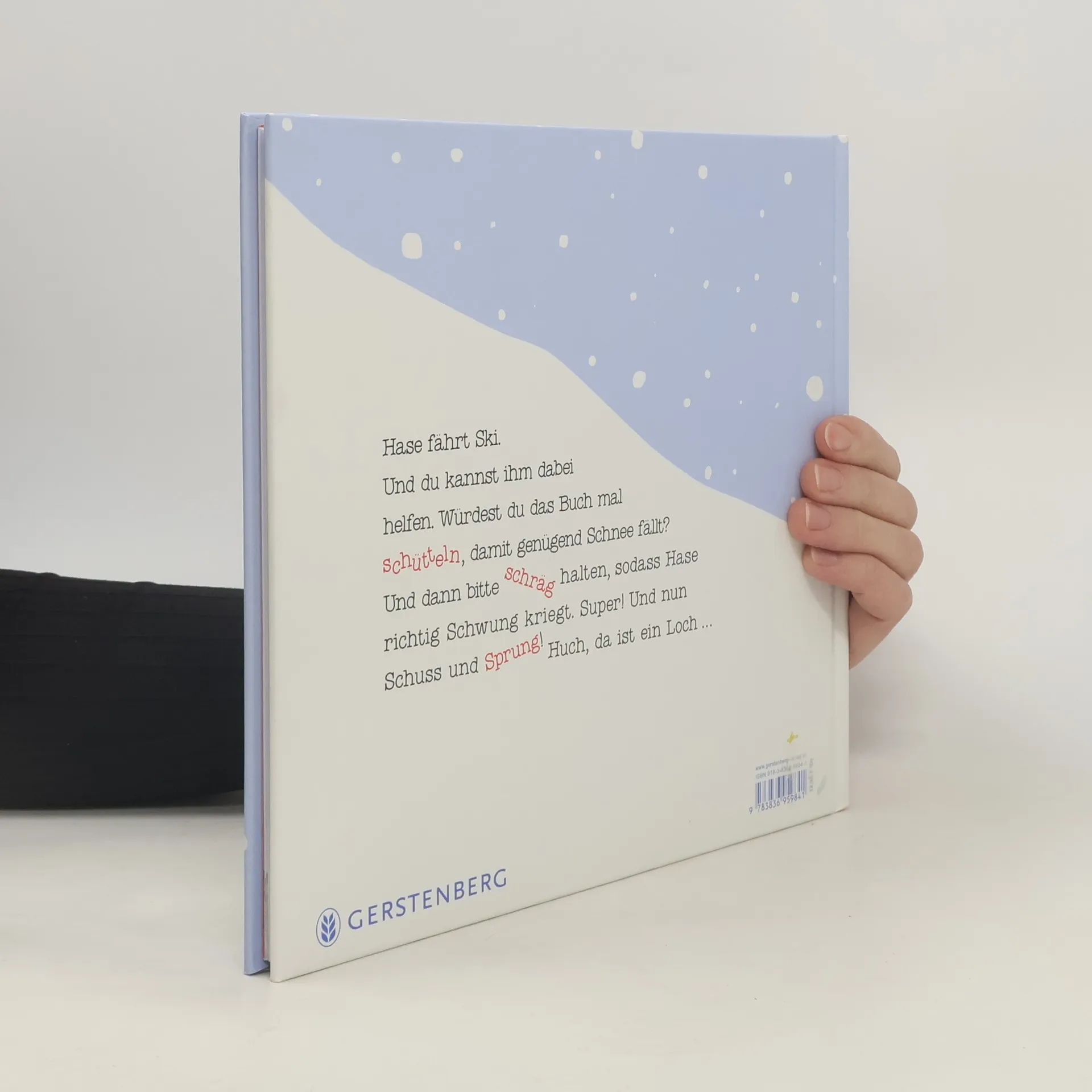 Hase will Ski fahren. Doch es gibt keinen Schnee! Da hilft nur eins: Das Buch kräftig schütteln, damit es schneit. Gut! Und noch mal. Äh, das war wohl ein bisschen zu viel. Mal eben oben auf das Buch klopfen, damit sich der Schnee verteilt ... Prima! Jetzt geht’s aber den Hang runter. Einfach das Buch schräg halten, damit Hase richtig Schwung bekommt. Und nun Schuss und Sprung! Huch, da ist ein Loch ... Ein lustiges und unterhaltsames Buch für kalte Wintertage. Und das Beste: Das winterliche Skivergnügen zum Mitmachen funktioniert garantiert auch ohne Schnee!