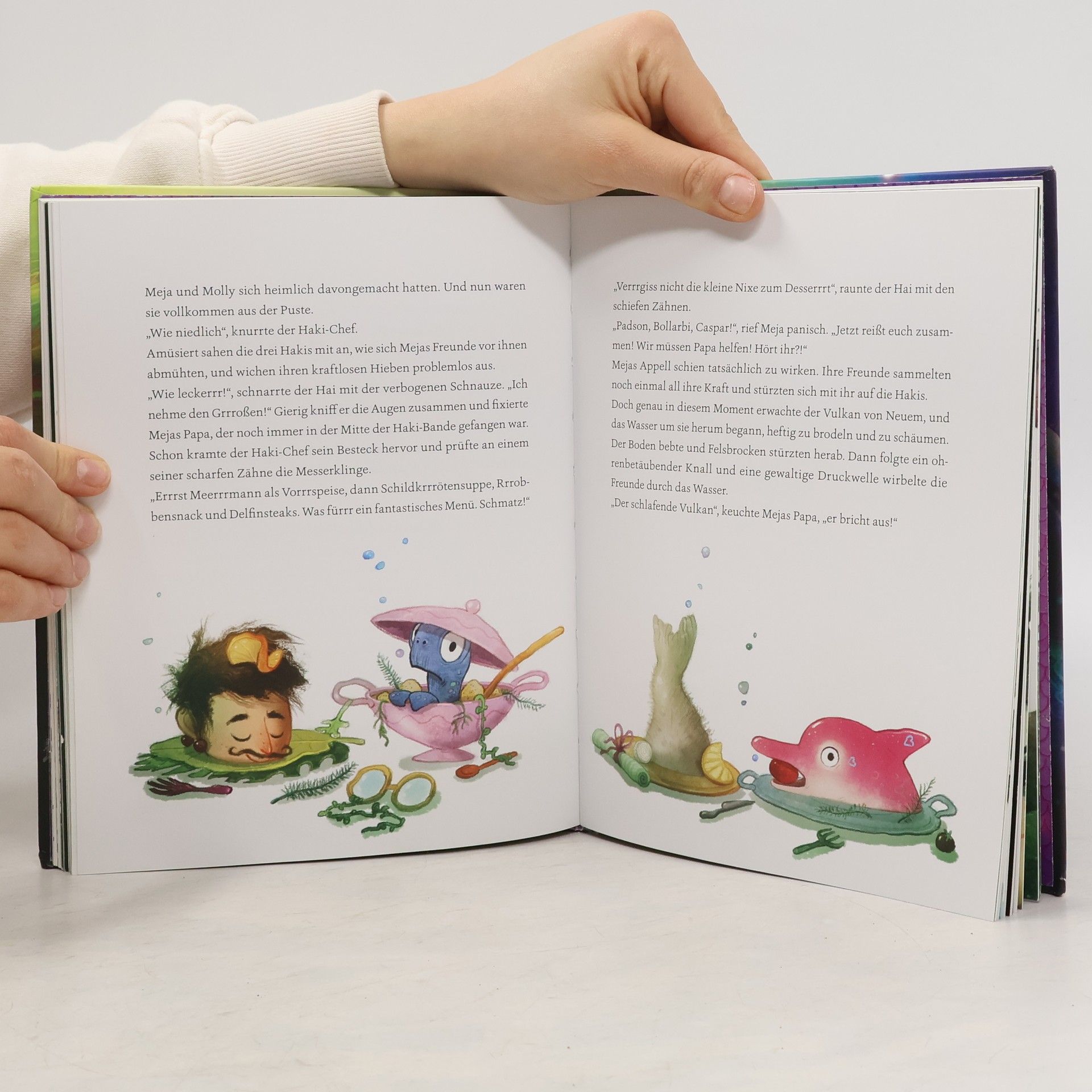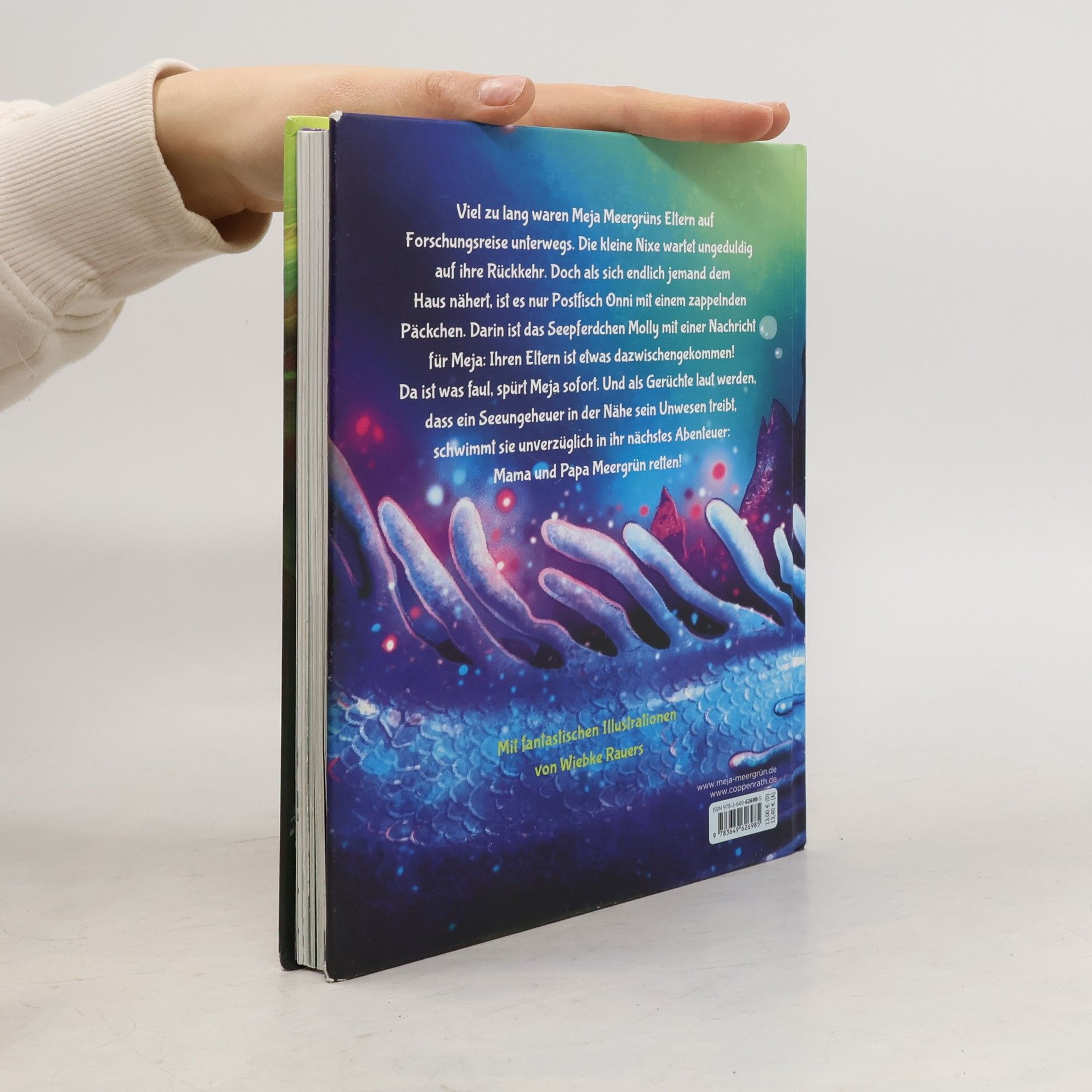 Endlich ist es so weit: Meja Meergrüns Eltern kommen von ihrer langen Forschungsreise zurück. Während das kleine Meermädchen zusammen mit Kümmerkröte Padson das Haus auf Vordermann bringt, liefert der Postbote ein geheimnisvolles Päckchen ab, mit einer Nachricht von Mejas Eltern, dass sich ihre Rückkehr leider verzögert. Als Trost schicken sie Meja ein kleines Seepferdchen namens Molly, das Meja mit seiner übermütigen Art die Wartezeit verkürzen soll. Doch Meja spürt sofort: Da stimmt etwas nicht. Und als Gerüchte laut werden, dass das Seeungeheuer Grönorm in der Nähe von Lyckhav sein Unwesen treibt, schwimmt sie unverzüglich in ihr nächstes Abenteuer: Mama und Papa Meergrün retten!