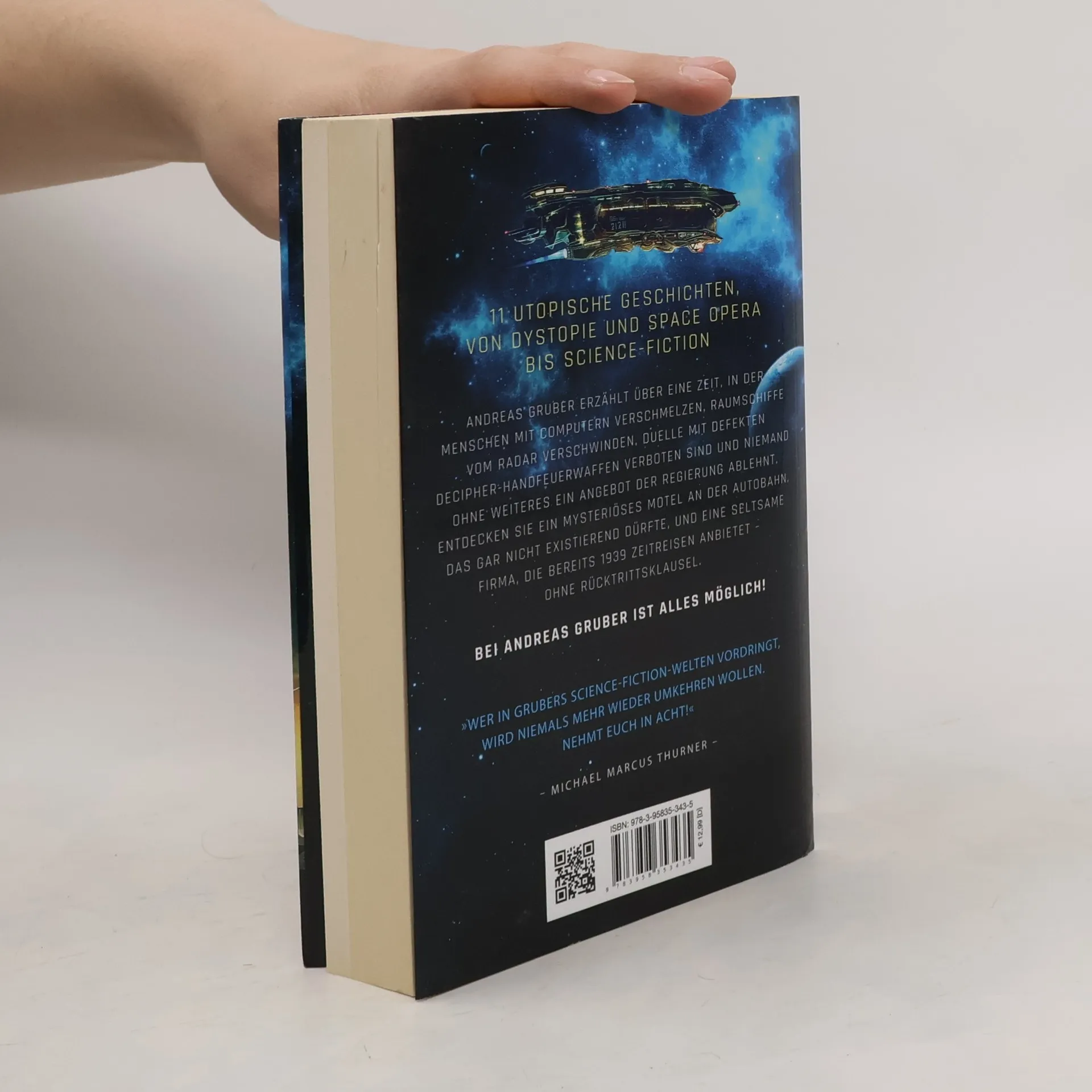 Andreas Gruber erzählt über eine Zeit, in der Menschen mit Computern verschmelzen, Raumschiffe vom Radar verschwinden, Mitbürger sich mit Downloads konditionieren lassen müssen, Duelle mit defekten Decipher-Handfeuerwaffen verboten sind und niemand ohne weiteres ein Angebot der Regierung ablehnt. Erfahren Sie, was am Rande des Universums existiert und warum ein Penner mit einem Notebook am Würstelstand die Zukunft der Menschheit kennt. Entdecken Sie ein mysteriöses Motel an der Autobahn, das gar nicht existieren dürfte, und eine seltsame Firma, die bereits seit 1939 Zeitreisen anbietet – allerdings ohne Rücktrittsklausel. „Wer in Grubers Science-Fiction-Welten vordringt, wird niemals mehr wieder umkehren wollen. Nehmt euch in Acht!“ [Michael Marcus Thurner]