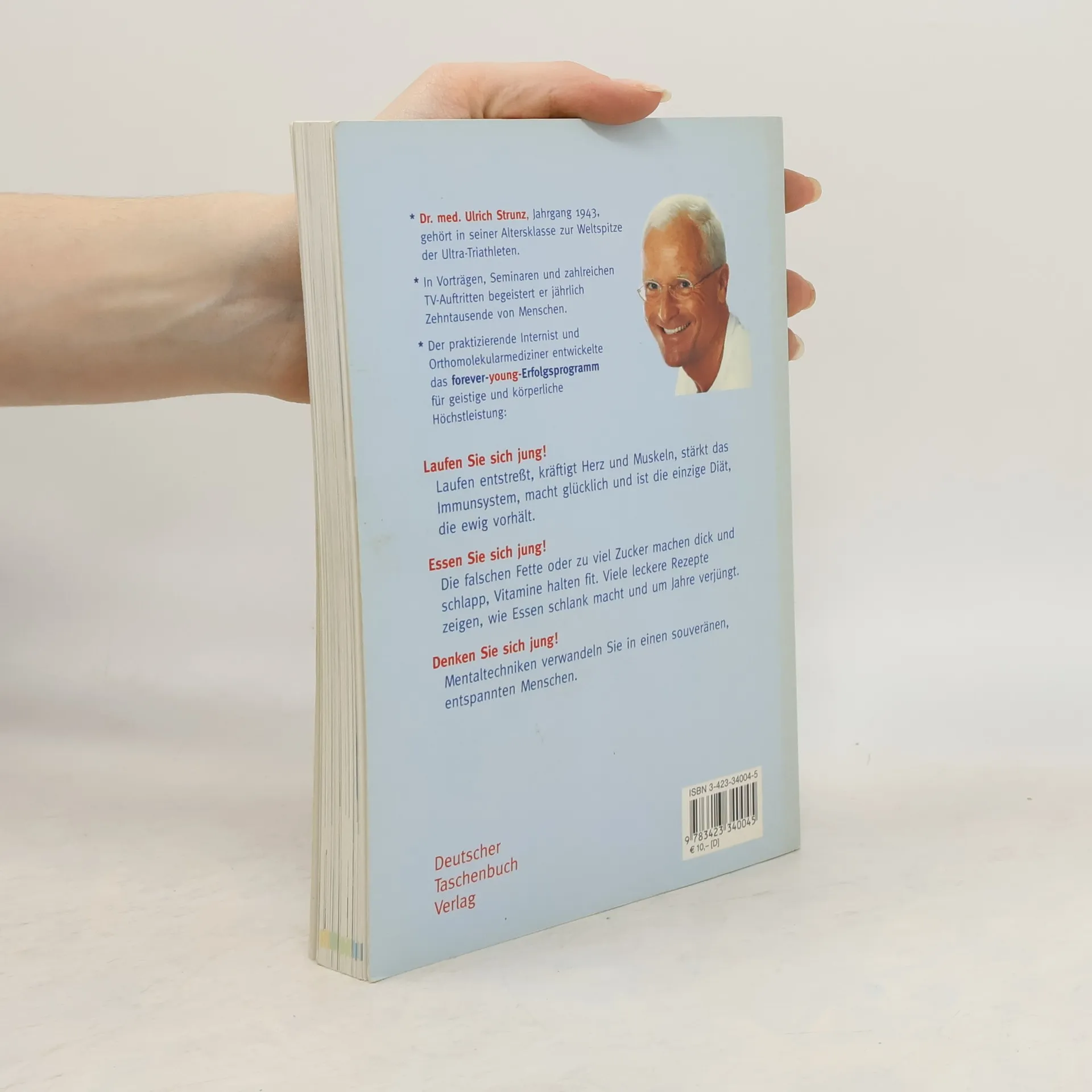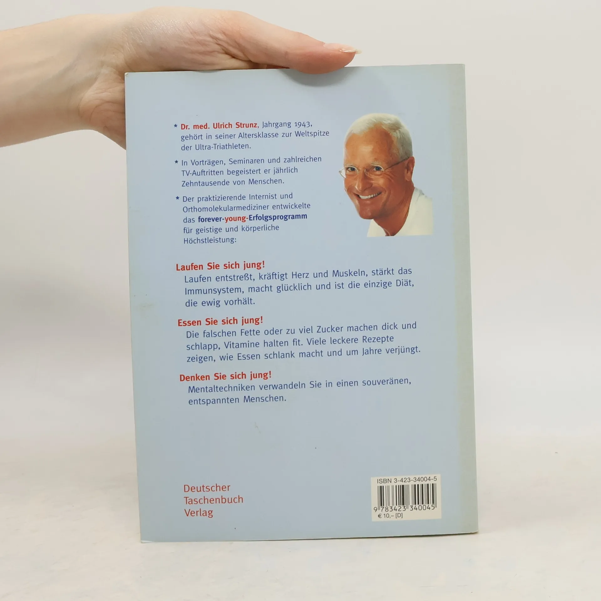 »Dieser Mann ändert Ihr Leben.« News Der Fitness-Bestseller - jetzt endlich im Taschenbuch! Jung aussehen, schnell denken, fit bleiben: Dr. med. Ulrich Strunz zeigt, wie Sie Ihre biologische Uhr zurückdrehen können. Werden Sie spielend körperlich und geistig topfit! Das Forever-young-Programm für körperliche und geistige Höchstleistung ruht auf drei Säulen: 1. Laufen Sie sich jung! Laufen ist eine Wunderpille: es entstresst, kräftigt Herz und Muskeln, stärkt das Immunsystem, macht glücklich und ist die einzige Diät, die ewig hält. 2. Essen Sie sich jung! Die falschen Fette oder zu viel Zucker machen dick und und schlapp, Vitamine halten fit. Viel leckere Rezepten zeigen, wie Essen schlank macht und um Jahre verjüngt. 3. Denken Sie sich jung! Mentaltechniken verwandeln Sie in einen souveränen, entspannten Menschen, der Ruhe und Gelassenheit ausstrahlt.