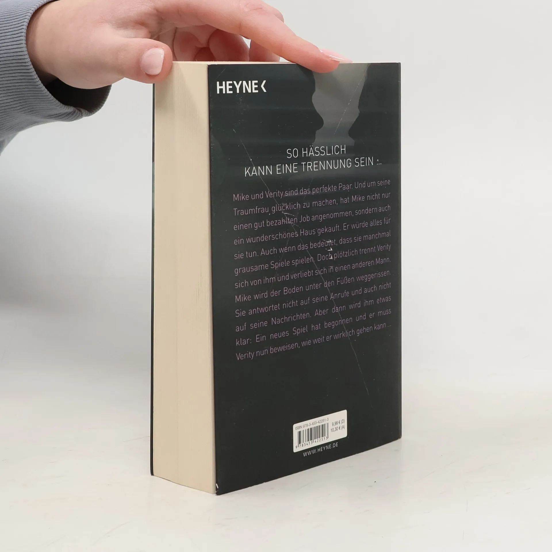 „Einer der verstörendsten Thriller, die ich seit Jahren gelesen habe.“ – Gillian Flynn Mike und Verity sind das perfekte Paar. Und um seine Traumfrau glücklich zu machen, hat Mike nicht nur einen gut bezahlten Job angenommen, sondern auch ein wunderschönes Haus gekauft. Er würde alles für sie tun. Auch wenn das bedeutet, dass sie manchmal grausame Spiele spielen. Doch plötzlich trennt Verity sich von ihm und verliebt sich in einen anderen Mann. Mike wird der Boden unter den Füßen weggerissen. Sie antwortet nicht auf seine Anrufe und auch nicht auf seine Nachrichten. Aber dann wird ihm etwas klar: Ein neues Spiel hat begonnen und er muss Verity nun beweisen, wie weit er wirklich gehen kann …