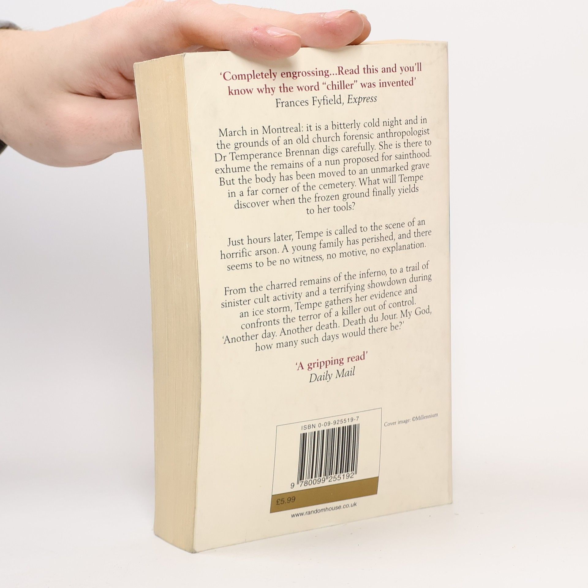 'Another day. Another death. Death du Jour. My God, how many such days would there be?' On a bitterly cold march night in Montreal, forensic anthropologiest Dr Temperance Brennan is exhuming the remains of a nun proposed for sainthood in the grounds of an old church. Just hours later, Tempe is called to the scene of an horrific arson. A young family has perished, and there seems to be no witness, no motive, no explanation. From the charred remains of the inferno, to a trail of sinister cult activity and a terrifying showdown during an ice storm, Tempe faces a nerve-shattering test of both her forensic expertise and her instinct for survival.