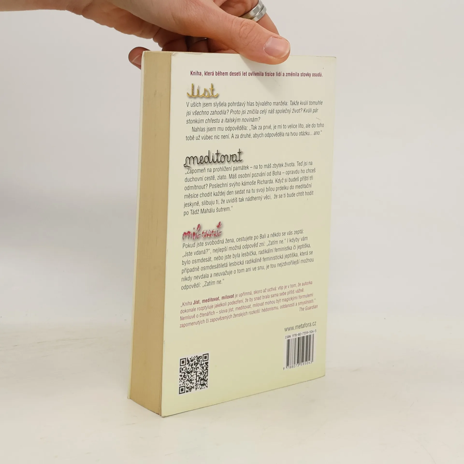 NOVĚ K 10. VÝROČÍ PRVNÍHO VYDÁNÍ. Pouť mladé dámy za pozemskými i duchovními rozkošemi napříč Itálií, Indií a Indonésií... Nové, doplněné vydání knižního (a filmového) bestselleru. Elizabeth má vše, co se od moderní Američanky očekává: manžela, dům a úspěšnou kariéru. Jenže místo aby se cítila šťastná, pohlcuje ji panika, zoufalství a zmatek. Odhodlá se tedy k radikálnímu kroku. Úplně sama se vydá na roční pouť kolem světa. V Itálii studuje umění rozkoše, flirtuje, nezřízeně hoduje a přibere deset nejšťastnějších kilogramů svého života. V Indii absolvuje čtyřměsíční duchovní cestu do vlastního nitra, na níž nechybí ani tak zdánlivé protiklady, jako je meditace, černý humor, mantry a vize. V Indonésii, kde se stane žačkou svérázného starého šamana, pak hledá svůj konečný cíl: rovnováhu a schopnost vybalancovat si život. JÍST... Kvůli pár stonkům chřestu a italským novinám jsi zničila náš společný život? MEDITOVAT... Uvidíš tak nádherný věci, že se ti bude chtít hodit po Tádž Mahálu šutrem. MILOVAT... Jste-li svobodná žena cestující po Bali, nejlepší odpověď na otázku „Jste vdaná?“, zní: „Zatím ne.“ Podle knihy vznikl rovněž úspěšný film s Julií Roberts v hlavní roli.