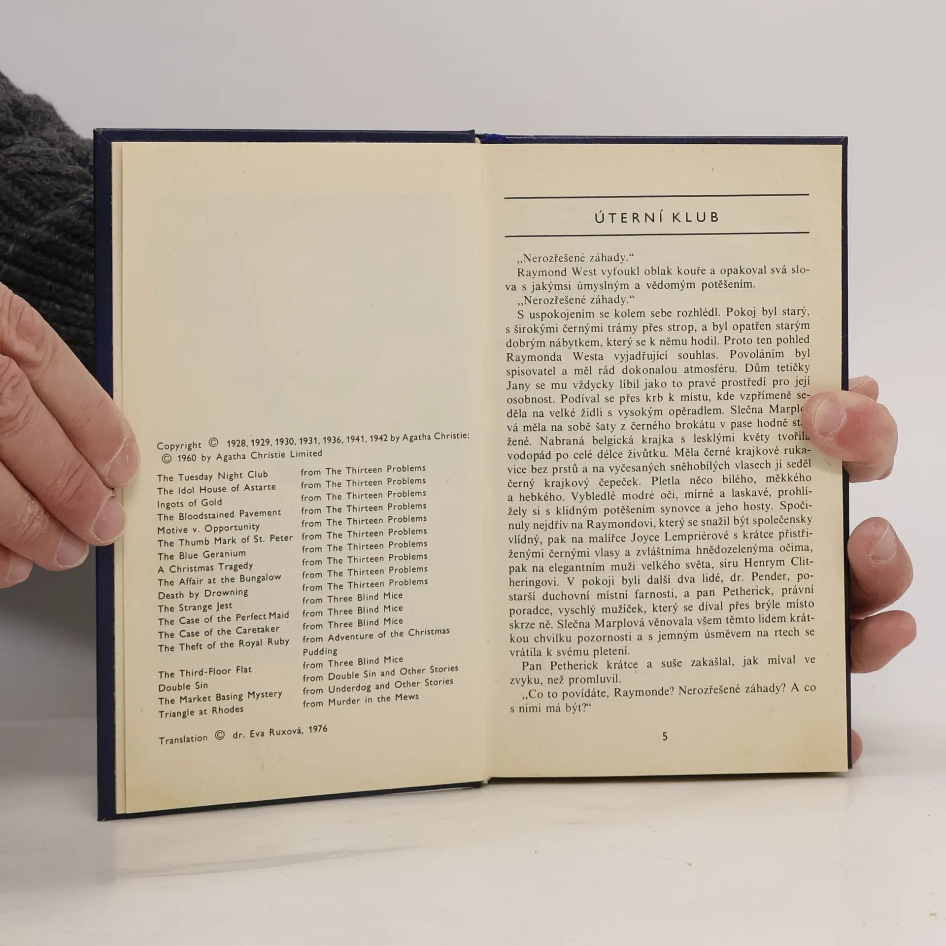 18 detektivních povídek, z nichž třináct řeší slečna Marplová (Úterní klub, Chrámek bohyně Astarty, Zlaté pruty, Krev na chodníku, Motiv contra příležitost, Znamení, Modrý muškát, Vánoční tragédie, Loupež ve víkendové chatě, Utopená, Podivný žert, Případ vzorné služebné, Případ domovnice) a zbylých pět pak Hercule Poirot (Královský rubín, Byt ve třetím patře, Dvojnásobný přestupek, Záhada na malém městě, Trojúhelník na ostrově).