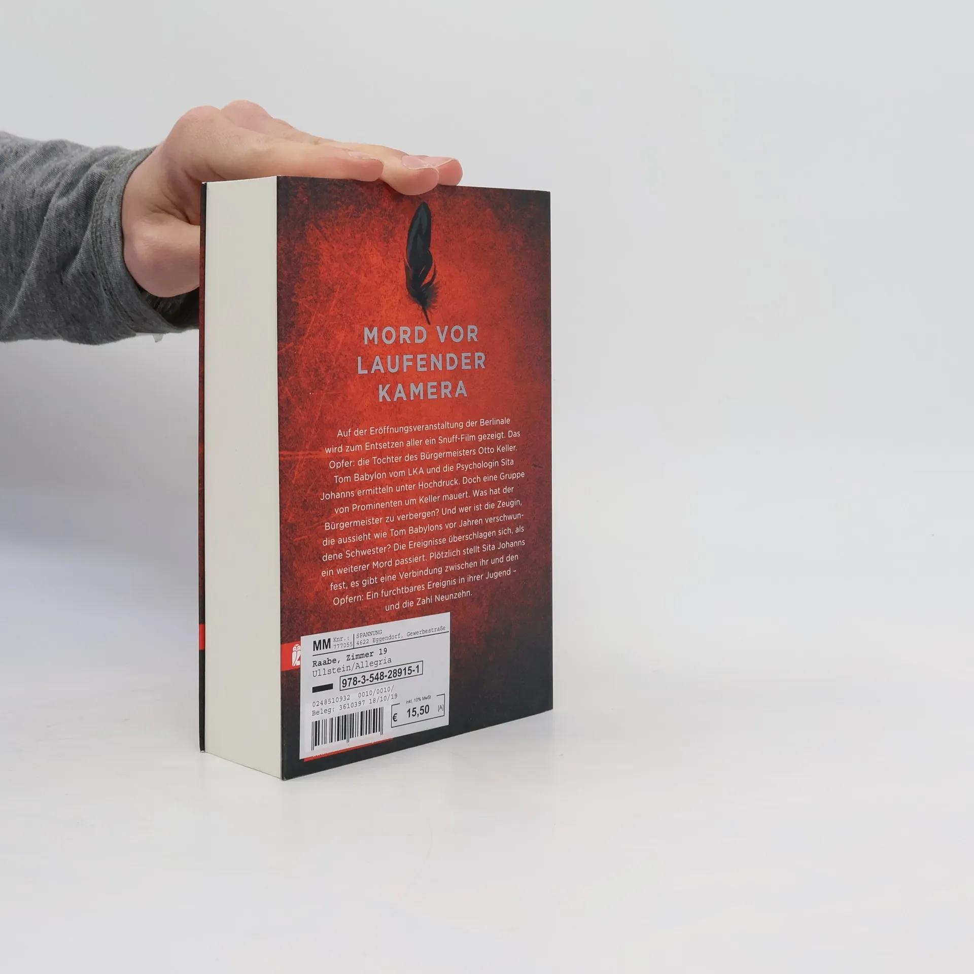 Der neue Thriller von Bestsellerautor Marc Raabe! MORD VOR LAUFENDER KAMERA Auf der Eröffnungsveranstaltung der Berlinale wird zum Entsetzen aller ein Snuff-Film gezeigt. Das Opfer: die Tochter des Bürgermeisters Otto Keller.Tom Babylon vom LKA und die Psychologin Sita Johanns ermitteln unter Hochdruck. Doch eine Gruppe von Prominenten um Keller mauert. Was hat der Bürgermeister zu verbergen? Und wer ist die Zeugin, die aussieht wie Tom Babylons vor Jahren verschwundene Schwester? Die Ereignisse überschlagen sich, als ein weiterer Mord passiert. Plötzlich stellt Sita Johanns fest, es gibt eine Verbindung zwischen ihr und den Opfern: Ein furchtbares Ereignis in ihrer Jugend - und die Zahl Neunzehn.