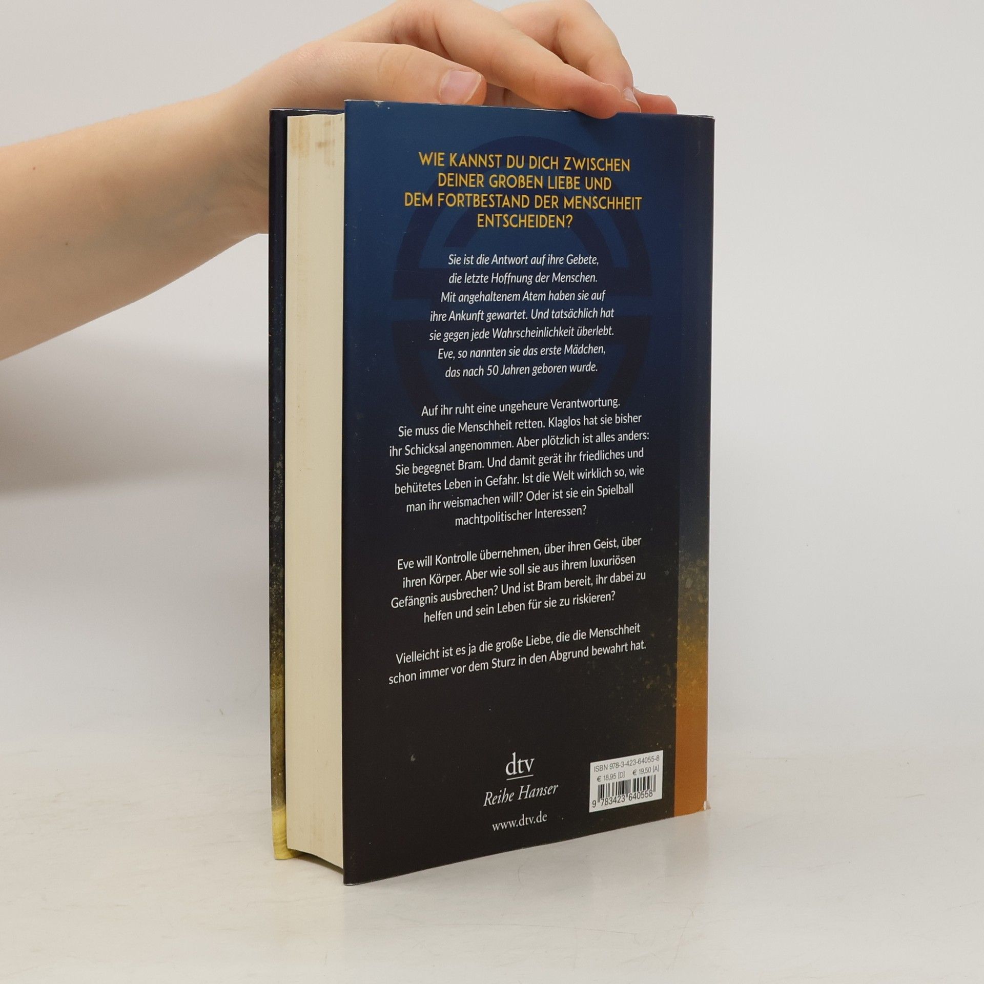 Sie ist die Antwort auf alle Gebete der Welt, die Hoffnung auf den Fortbestand der Menschheit: Nach einem halben Jahrhundert wird endlich wieder ein Mädchen geboren - Eve. Isoliert von der Außenwelt wächst sie in einem goldenen Käfig auf. Jetzt, mit 16 Jahren, soll sie aus drei Kandidaten ihren Partner wählen. Eve war sich ihrer Verantwortung immer bewusst und hat widerspruchlos die schwere Bürde für den Fortbestand der Menschheit getragen. Doch nun trifft sie Bram, und die Zweifel an der Aufrichtigkeit der Motive ihrer >>Beschützer<< wachsen. Eve will die Wahrheit wissen, über die Welt, über ihre Familie, über die Liebe, die sie für Bram fühlt. Sie will Kontrolle über ihr Leben, sie will Freiheit. Doch darf sie für ihr privates Glück die Zukunft der Menschheit aufs Spiel setzen? (Quelle: Website des Verlags)