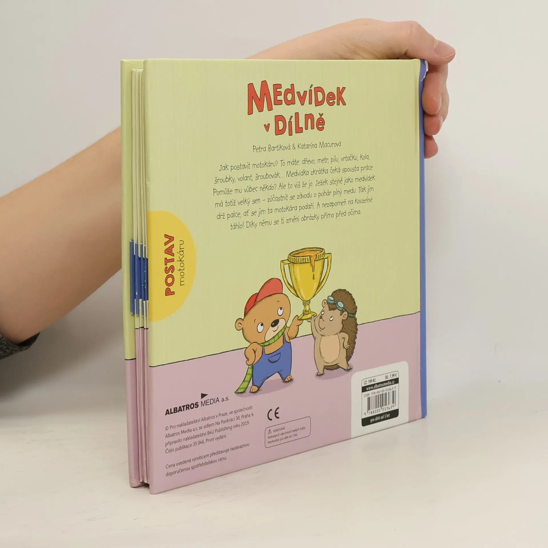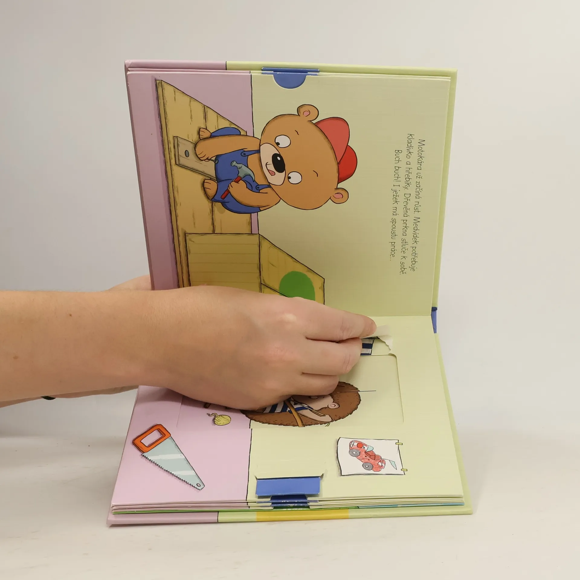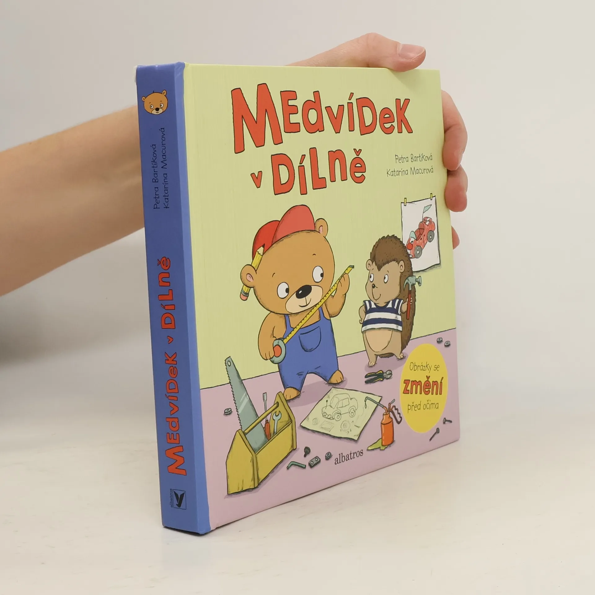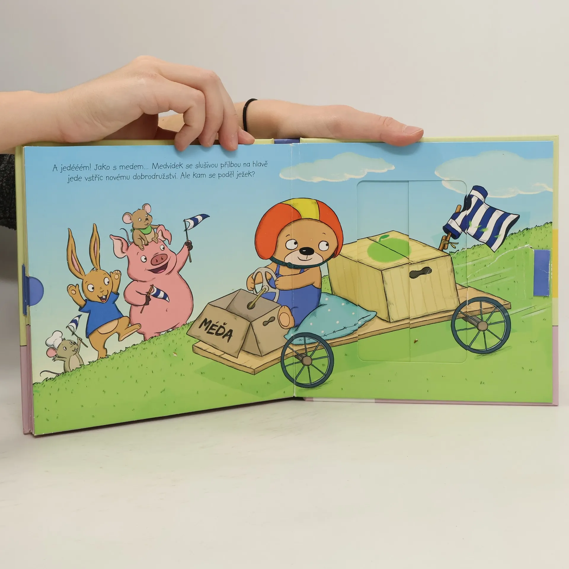 Medvídkovi při sestrojování motokáry pomáhá ježeček. Je to ale náramný popleta. Veselé leporelo s pohyblivými obrázky a roztomilými ilustracemi.