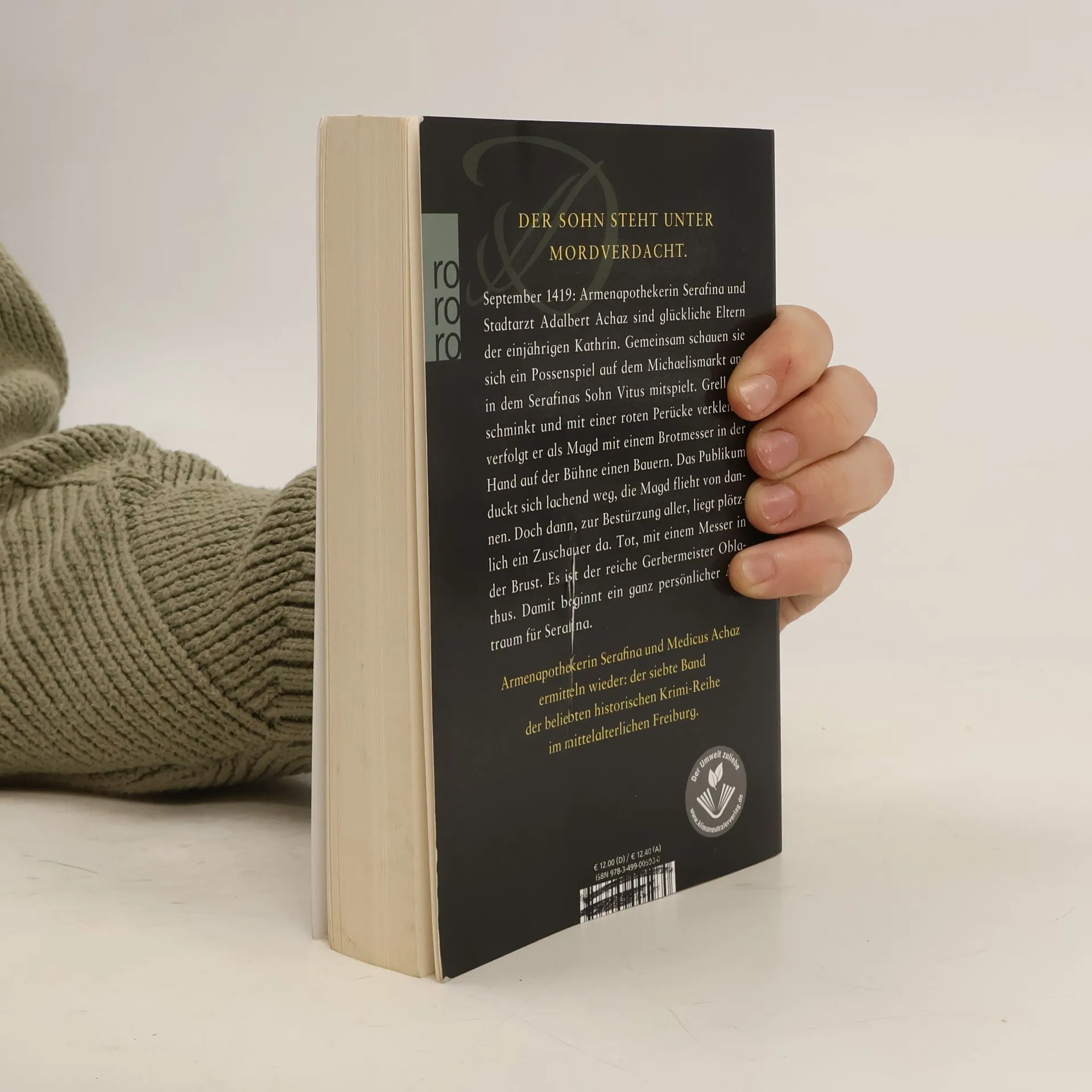 Der neue Band der beliebten historischen Krimi-Reihe: Armenapothekerin Serafina ermittelt in Freiburg. September 1419: Armenapothekerin Serafina und Stadtarzt Adalbert Achaz sind glückliche Eltern der einjährigen Kathrin. Gemeinsam schauen sie sich ein Possenspiel auf dem Michaelismarkt an, in dem Serafinas Sohn Vitus die Magd spielt. Grell geschminkt und mit einer roten Perücke verkleidet, verfolgt die Magd mit einem Brotmesser in der Hand im Stück einen Bauern. Das Publikum duckt sich lachend weg, die Magd flieht von dannen. Dann folgt der Schock: Ein Zuschauer liegt da, mit einem Messer in der Brust. Es ist der reiche Gerbermeister Oblathus. Damit beginnt ein ganz persönlicher Albtraum für Serafina.