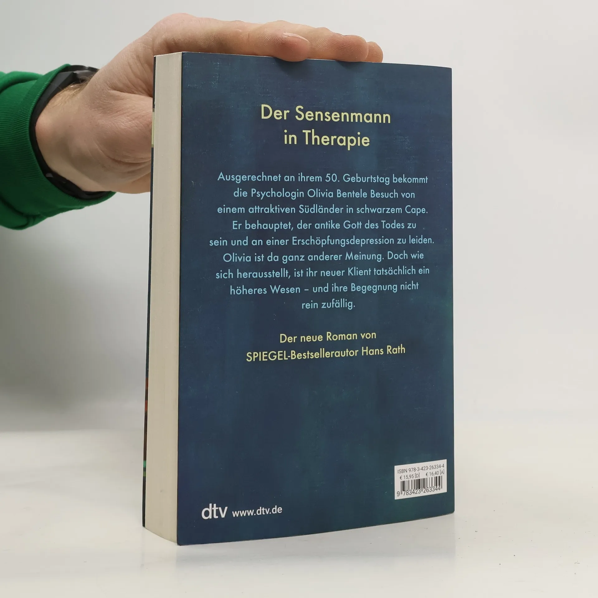 Der Sensenmann in Therapie Ausgerechnet an ihrem 50. Geburtstag bekommt die Psychologin Liv Bentele Besuch von einem attraktiven Südländer in schwarzem Cape. Leider hat sich der Mann nur in der Tür geirrt. Aber dann ist plötzlich die alte Dame tot, nach der er sich erkundigt hat, und Liv stellt ihn zur Rede. In Wahrheit sei er Thanatos, der griechische Gott des sanften Todes, antwortet er freundlich, und ja, es deprimiere ihn zutiefst, wie unwürdig das Sterben heute sei. Liv sieht in ihm eher einen von Todessehnsucht geplagten Neurotiker und bietet ihm therapeutische Hilfe an. Bei ihrem lebhaften Austausch stellt sich heraus, dass Livs neuer Klient tatsächlich der Sensenmann ist – und sich nicht in der Tür geirrt hat.