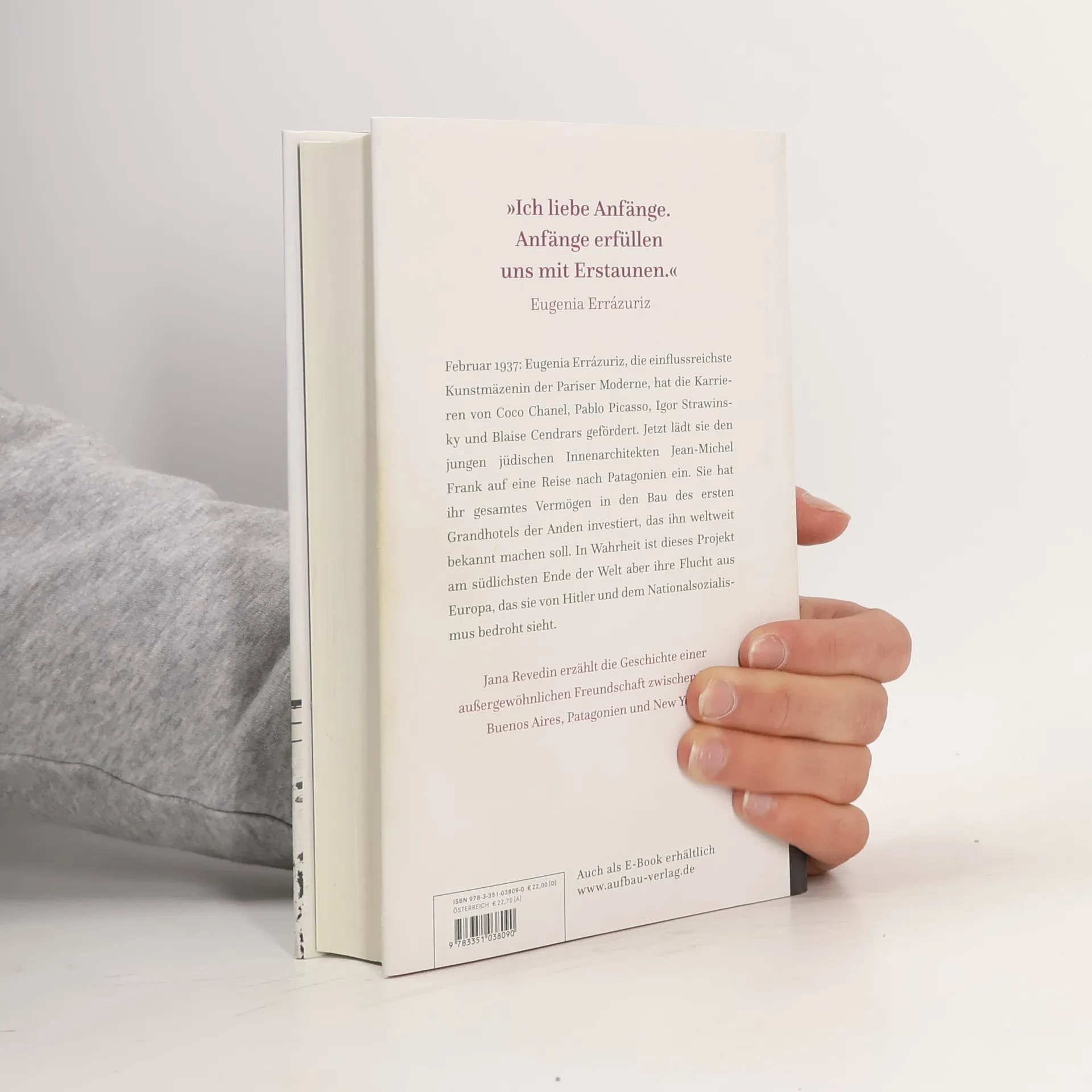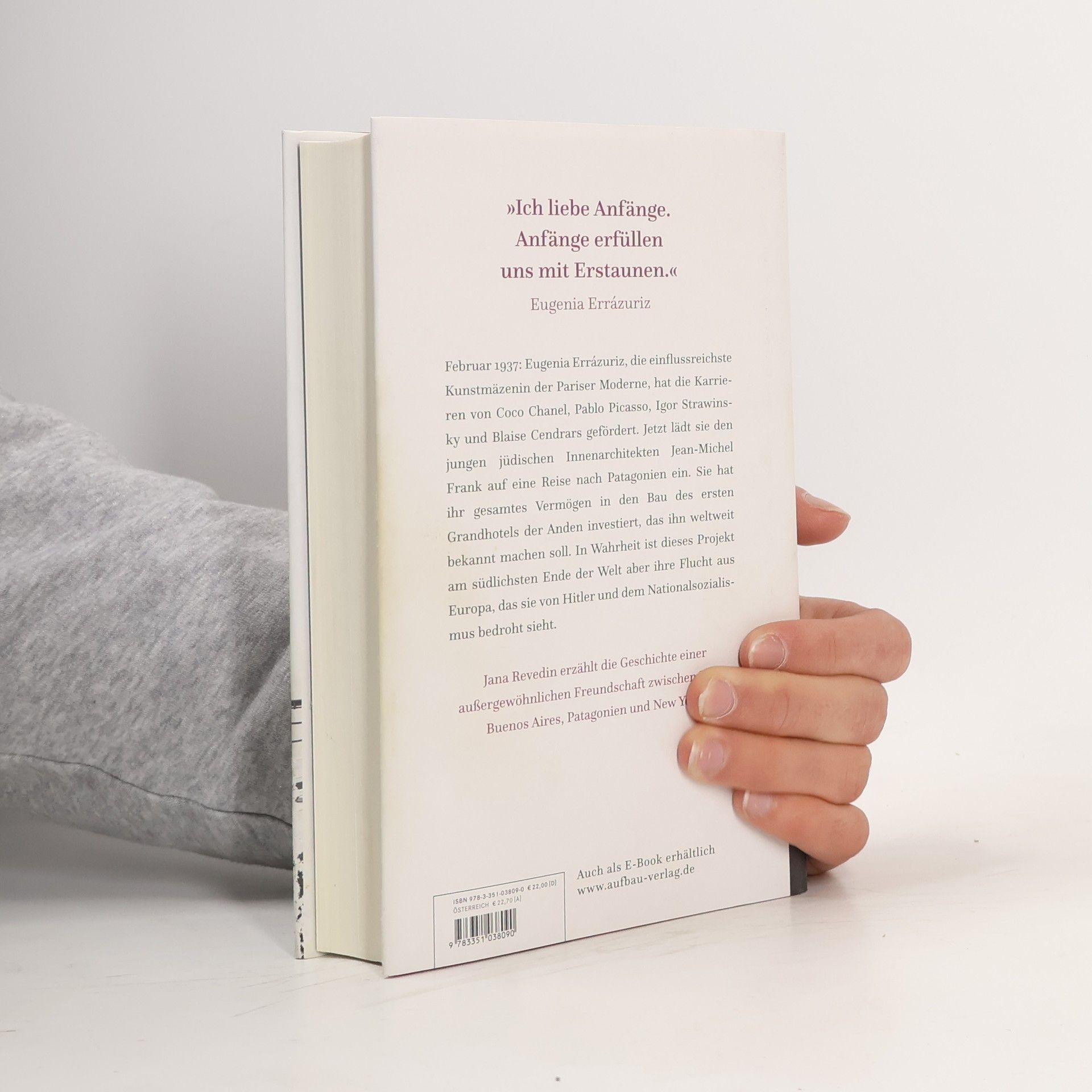 „Ich liebe Anfänge. Anfänge erfüllen uns mit Erstaunen.“ Eugenia Errázuriz Februar 1937: Eugenia Errázuriz, die einflussreichste Kunstmäzenin der Pariser Moderne, hat die Karrieren von Coco Chanel, Pablo Picasso und Blaise Cendrars gefördert. Jetzt lädt sie den jungen jüdischen Innenarchitekten Jean-Michel Frank auf eine Reise nach Patagonien ein. Sie hat ihr gesamtes Vermögen in den Bau des ersten Grandhotels der Anden investiert, das ihn weltweit bekannt machen soll. In Wahrheit ist dieses Projekt am südlichsten Ende der Erde aber ihre gemeinsame Flucht aus Europa, das sie von Hitler und dem Nationalsozialismus bedroht sieht. Jana Revedin erzählt die Geschichte einer außergewöhnlichen Freundschaft zwischen Paris, Patagonien, Buenos Aires und New York.