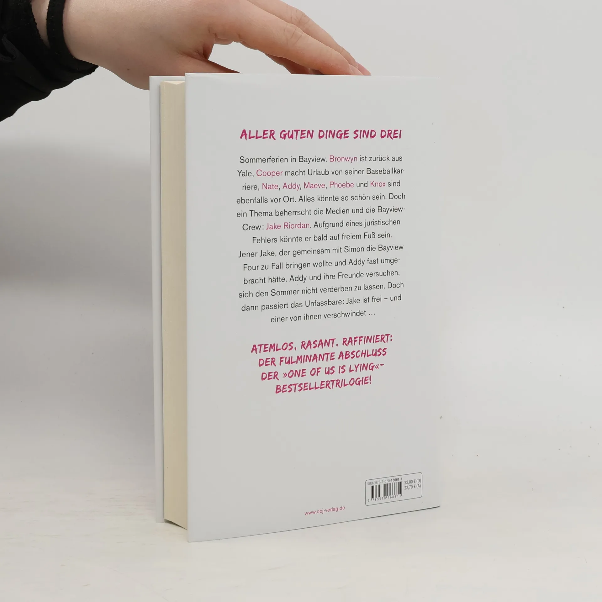 Willkommen zurück in Bayview. Es ist Sommer. Und einer von uns ist wieder da. Sommerferien in Bayview. Addy und ihre Freunde treffen zusammen, um Zeit miteinander zu verbringen: Bronwyn ist zurück aus Yale, Cooper macht Urlaub von seiner Baseballkarriere, Nate, Maeve, Phoebe und Knox sind ebenfalls vor Ort. Alles könnte so entspannt sein. Doch ein Thema beherrscht die Medien und die Bayview-Crew: Aufgrund eines juristischen Fehlers könnte Jake Riordan bald auf freiem Fuß sein und in Berufung gehen. Jener Jake, der mit Simon gegen die Bayview Four intrigierte und Addy fast umgebracht hätte. Addy und ihre Freunde wollen sich den Sommer dennoch nicht verderben lassen. Doch dann ist Jake auf freiem Fuß. Und eine von ihnen verschwindet … Rasant, sexy, umwerfend: der neue raffinierte Thriller von der Weltbestsellerautorin von »One of us is lying«! Mit meisterhaft geplotteten Wendungen und einnehmenden, komplexen Figuren garantieren McManus' Bücher eine Suchtgefahr, der man sich nicht entziehen kann. Weitere Titel der Autorin bei cbj: One of us is lying One of us is next Two can keep a secret The cousins You will be the death of me Nothing more to tell Alle Bücher können unabhängig voneinander gelesen werden.