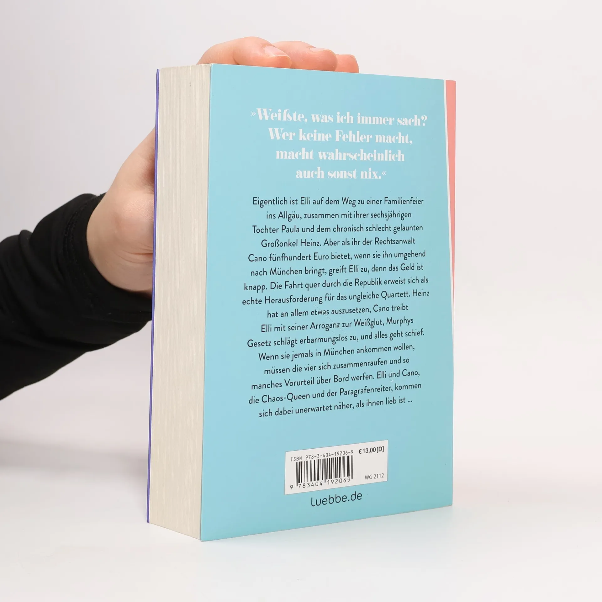 Eigentlich ist Elli auf dem Weg zu einer Familienfeier ins Allgäu, zusammen mit ihrer sechsjährigen Tochter Paula und dem chronisch schlecht gelaunten Großonkel Heinz. Aber als ihr der Rechtsanwalt Cano fünfhundert Euro bietet, wenn sie ihn umgehend nach München bringt, greift Elli zu, denn das Geld ist knapp. Die Fahrt quer durch die Republik erweist sich als echte Herausforderung für das ungleiche Quartett. Heinz hat an allem etwas auszusetzen, Cano treibt Elli mit seiner Arroganz zur Weißglut, Murphys Gesetz schlägt erbarmungslos zu, und alles geht schief. Wenn sie jemals in München ankommen wollen, müssen die vier sich zusammenraufen und so manches Vorurteil über Bord werfen. Elli und Cano, die Chaos-Queen und der Paragrafenreiter, kommen sich dabei unerwartet näher, als ihnen lieb ist ...