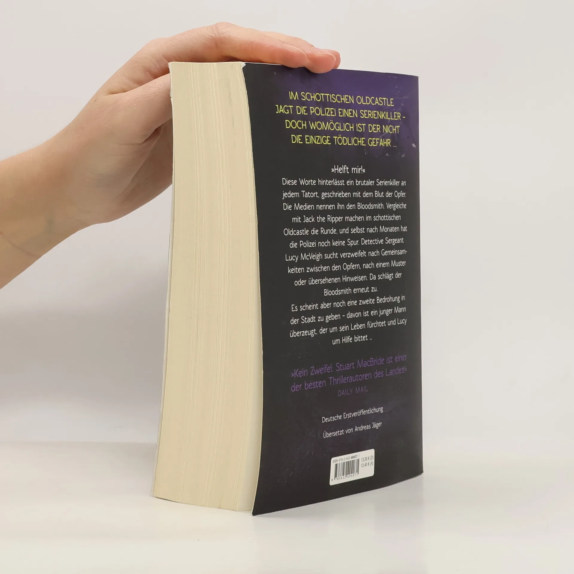 »Stuart MacBride ist mit jedem Thriller ein Lektüre-Muss für mich. Immer schnell, hart, authentisch – und anders.« Lee Chid »Helft mir!« Diese Worte hinterlässt ein brutaler Serienkiller an jedem Tatort, geschrieben mit dem Blut der Opfer. Die Medien nennen ihn den Bloodsmith. Vergleiche mit Jack the Ripper machen im schottischen Oldcastle die Runde, und selbst nach Monaten hat die Polizei noch keine Spur. Detective Sergeant Lucy McVeigh sucht verzweifelt nach Gemeinsamkeiten zwischen den Opfern, nach einem Muster oder übersehenen Hinweisen. Da schlägt der Bloodsmith erneut zu. Es scheint aber noch eine zweite Bedrohung in der Stadt zu geben – davon ist ein junger Mann überzeugt, der um sein Leben fürchtet und Lucy um Hilfe bittet. »Kein Zweifel: Stuart MacBride ist einer der besten Thrillerautoren des Landes.« Daily Mail