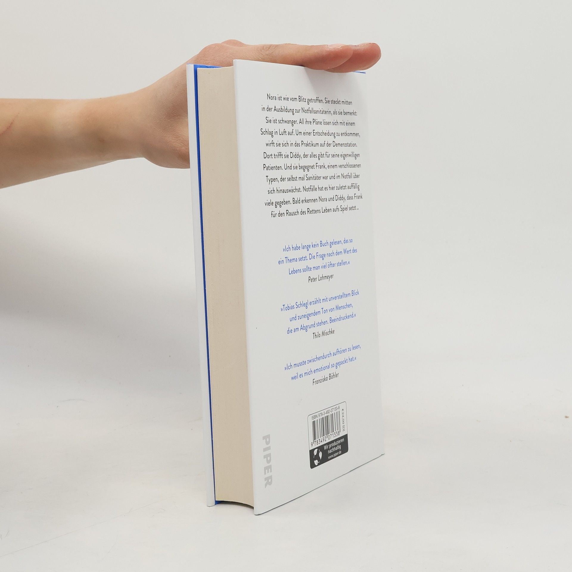 »Ich musste zwischendurch aufhören zu lesen, weil es mich emotional so gepackt hat.« Franziska Böhler Nora ist wie vom Blitz getroffen. Sie steckt mitten in der Ausbildung zur Notfallsanitäterin, als sie bemerkt: Sie ist schwanger. All ihre Pläne lösen sich plötzlich in Luft auf. Um einer Entscheidung zu entkommen, wirft sie sich in das Praktikum auf der Demenzstation. Dort trifft sie Diddy, der alles gibt für seine eigenwilligen Patienten. Und sie begegnet Frank, einem verschlossenen Typen, der selbst mal Sanitäter war und im Notfall über sich hinauswächst. Notfälle hat es hier zuletzt auffällig viele gegeben. Bald erkennen Nora und Diddy, dass Frank für den Rausch des Rettens Leben aufs Spiel setzt … »Echte Helden tragen keine Capes, sondern Crocs. Ein berührender Roman, ein Zeitzeugnis.« Ronja von Rönne »Ich habe lange kein Buch gelesen, das so ein Thema setzt. Die Frage nach dem Wert des Lebens sollte man viel öfter stellen.« Peter Lohmeyer »Tobias Schlegl erzählt mit unverstelltem Blick und zuneigendem Ton von Menschen, die am Abgrund stehen. Beeindruckend.« Thilo Mischke »Tobias Schlegl hat überhaupt kein Problem damit, dahin zu gehen, wo es weh tut. Und: Man will ihm folgen.« Sarah Bosetti