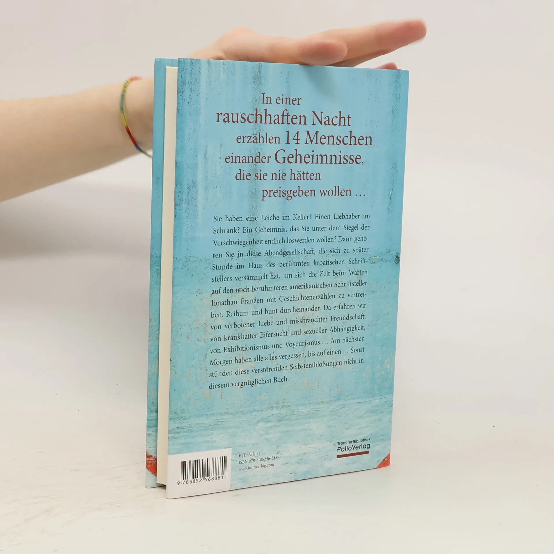 In einer rauschhaften Nacht erzählen 14 Menschen einander Geheimnisse, die sie nie hätten preisgeben wollen … Sie haben eine Leiche im Keller? Einen Liebhaber im Schrank? Ein Geheimnis, das Sie unter dem Siegel der Verschwiegenheit endlich loswerden wollen? Dann gehören Sie in diese Abendgesellschaft, die sich zu später Stunde im Haus des berühmten kroatischen Schriftstellers versammelt hat, um sich die Zeit beim Warten auf den noch berühmteren amerikanischen Schriftsteller Jonathan Franzen mit Geschichtenerzählen zu vertreiben. Reihum und bunt durcheinander. Da erfahren wir von verbotener Liebe und missbrauchter Freundschaft, von krankhafter Eifersucht und sexueller Abhängigkeit, von Exhibitionismus und Voyeurismus … Am nächsten Morgen haben alle alles vergessen, bis auf einen … Sonst stünden diese verstörenden Selbstentblößungen nicht in diesem vergnüglichen Buch. „Jedes geordnete System tendiert zur Entropie, die kleinste Bewegung reicht aus, um alles auseinanderfallen zu lassen. Wenn das für das gesamte Universum gilt, gilt es auch für menschliche Beziehungen.“ Drago Glamuzina