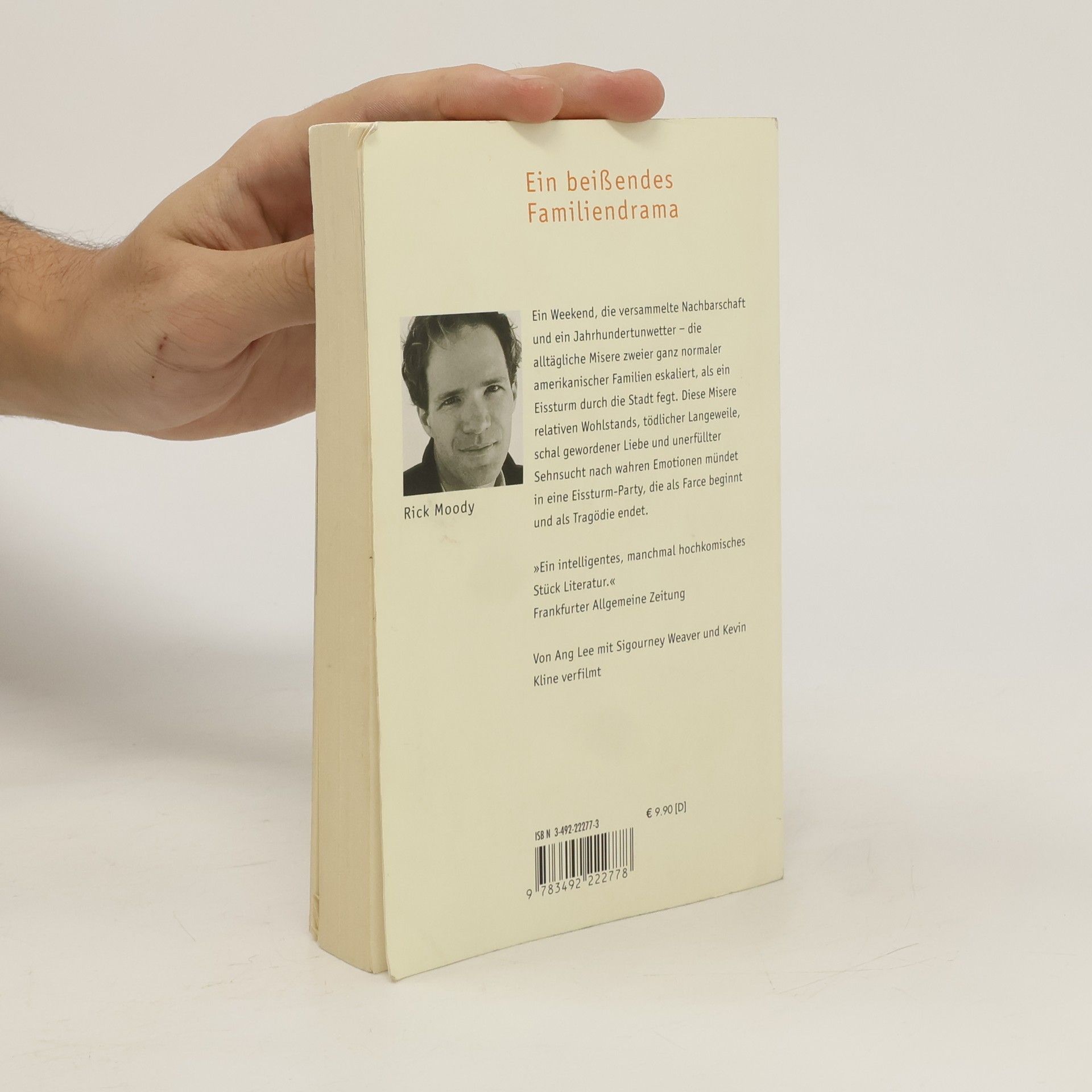 Ein Weekend, die versammelte Nachbarschaft und ein Jahrhundertunwetter – die alltägliche Misere zweier ganz normaler amerikanischer Familien eskaliert, als ein Eissturm durch die Stadt fegt. Diese Misere relativen Wohlstands, tödlicher Langeweile, schal gewordener Liebe und unerfüllter Sehnsucht nach wahren Emotionen mündet in eine Eissturm-Party, die als Farce beginnt und als Tragödie endet. 'Ein intelligentes, manchmal hochkomisches Stück Literatur.' Frankfurter Allgemeine Zeitung Von Ang Lee mit Sigourney Weaver und Kevin Kline verfilmt.