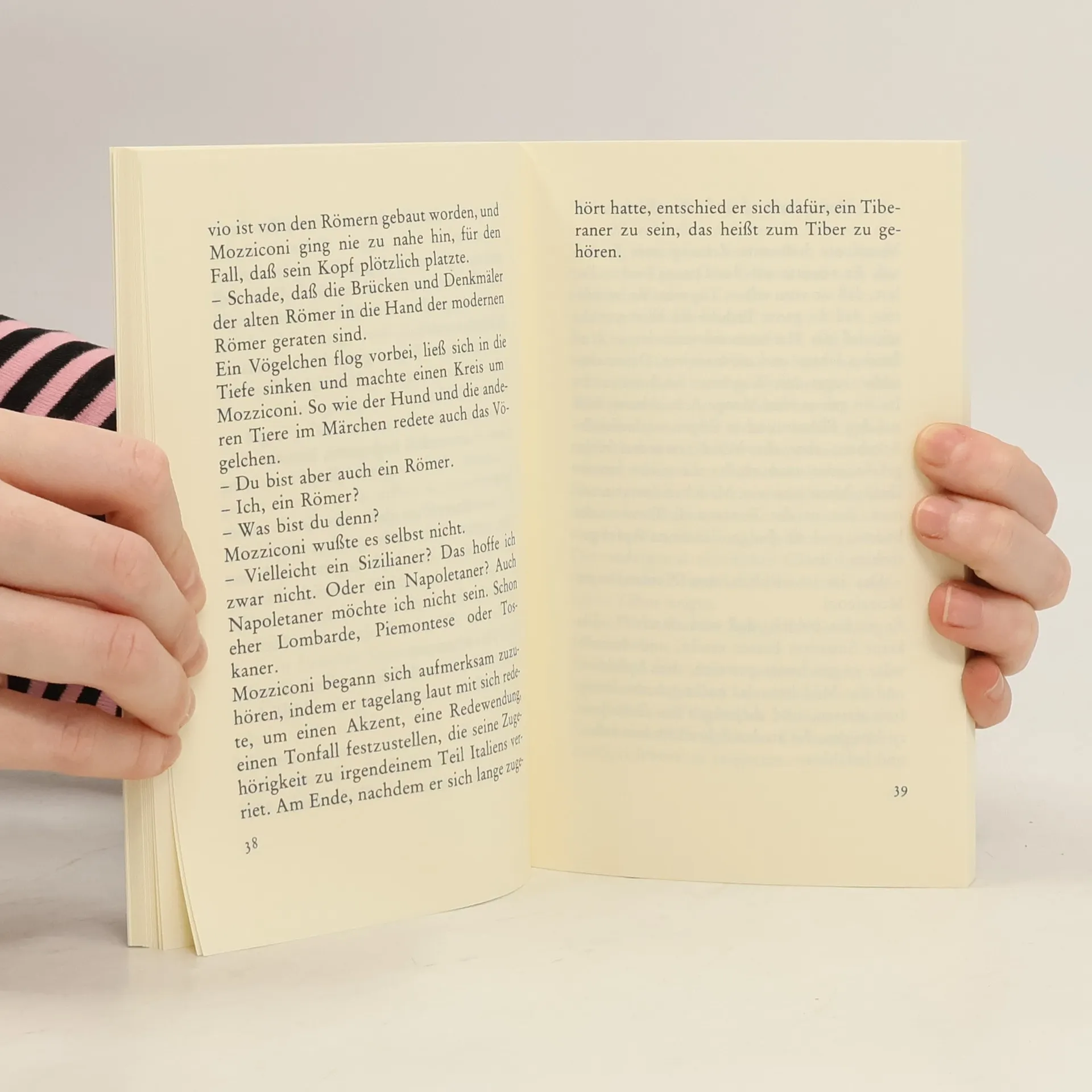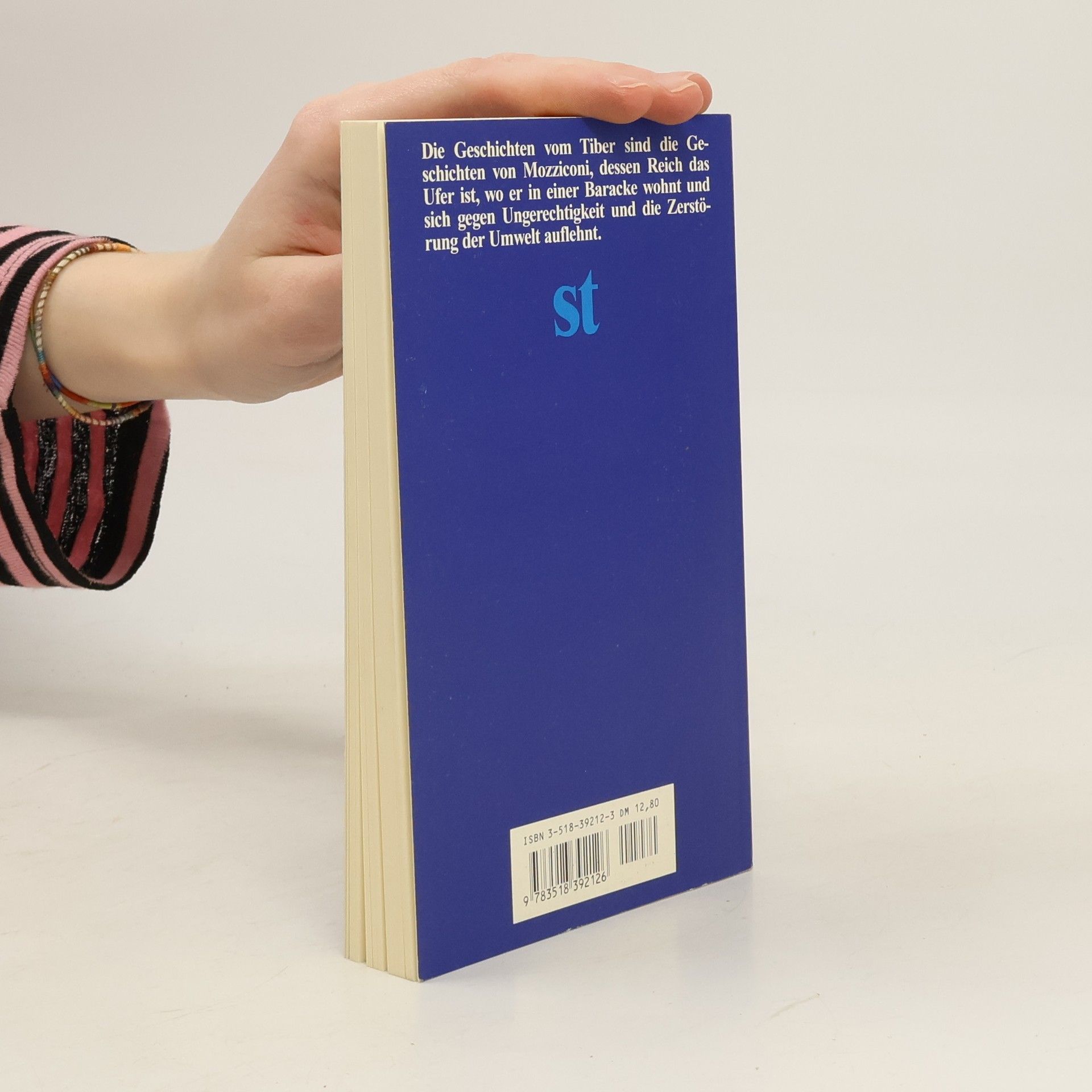Die Geschichten vom Ufer des Tibers, sind die Geschichten von Mozziconi, dessen Reich das Ufer des Tibers ist. , Hier will ich mich ausruhn, , sagt Mozziconi, , und endlich einmal an nichts denken., Es versteht sich, daß auch an nichts denken eine Art von Denken ist, die anstrengt, und schon denkt Mozziconi nach. Mozziconi, der Philosoph, ist das Gegengewicht zur Betriebsamkeit und Zerstörungswut dieser Welt. Doch gelassen ist er nicht. Er ist aufbrausend, wenn es um Betrug, Geldgier, Erdöl geht. Und wenn er wider Willen denken muß, kann es geschehen, daß er vor Zorn seinen Hut in den Fluten des Tibers versenkt.