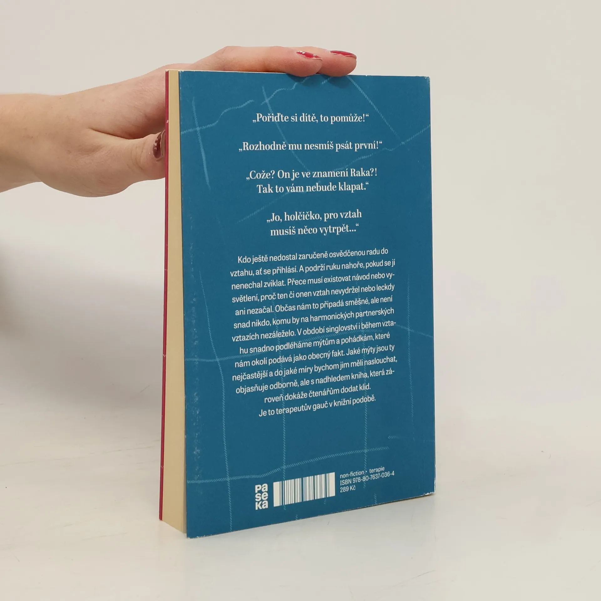"Pořiďte si dítě, to pomůže!" "Rozhodně mu nesmíš psát první!" "Cože? On je ve znamení Raka?! Tak to vám nebude klapat. "Jo, holčičko, pro vztah musíš něco vytrpět..." Kdo ještě nedostal zaručeně osvědčenou radu do vztahu, ať se přihlásí. A podrží ruku nahoře, pokud se jí nenechal zviklat. Přece musí existovat návod nebo vysvětlení, proč ten či onen vztah nevydržel nebo leckdy ani nezačal. Občas nám to připadá směšné, ale není snad nikdo, komu by na harmonických partnerských vztazích nezáleželo. V období singlovství i během vztahu snadno podléháme mýtům a pohádkám, které nám okolí podává jako obecný fakt. Jaké mýty jsou ty nejčastější a do jaké míry bychom jim měli naslouchat, objasňuje odborně, ale s nadhledem kniha, která zároveň dokáže čtenářům dodat klid. Je to terapeutův gauč v knižní podobě.