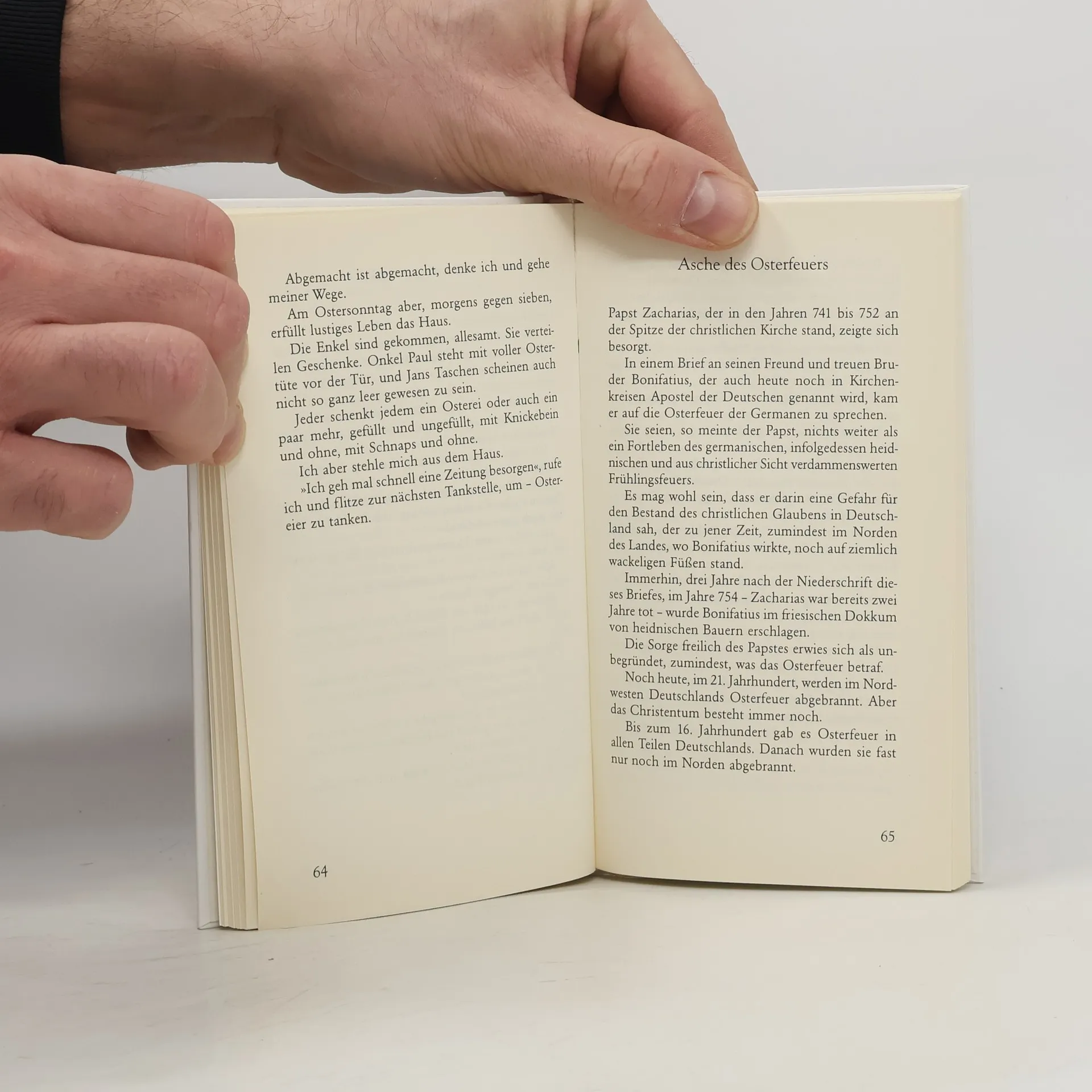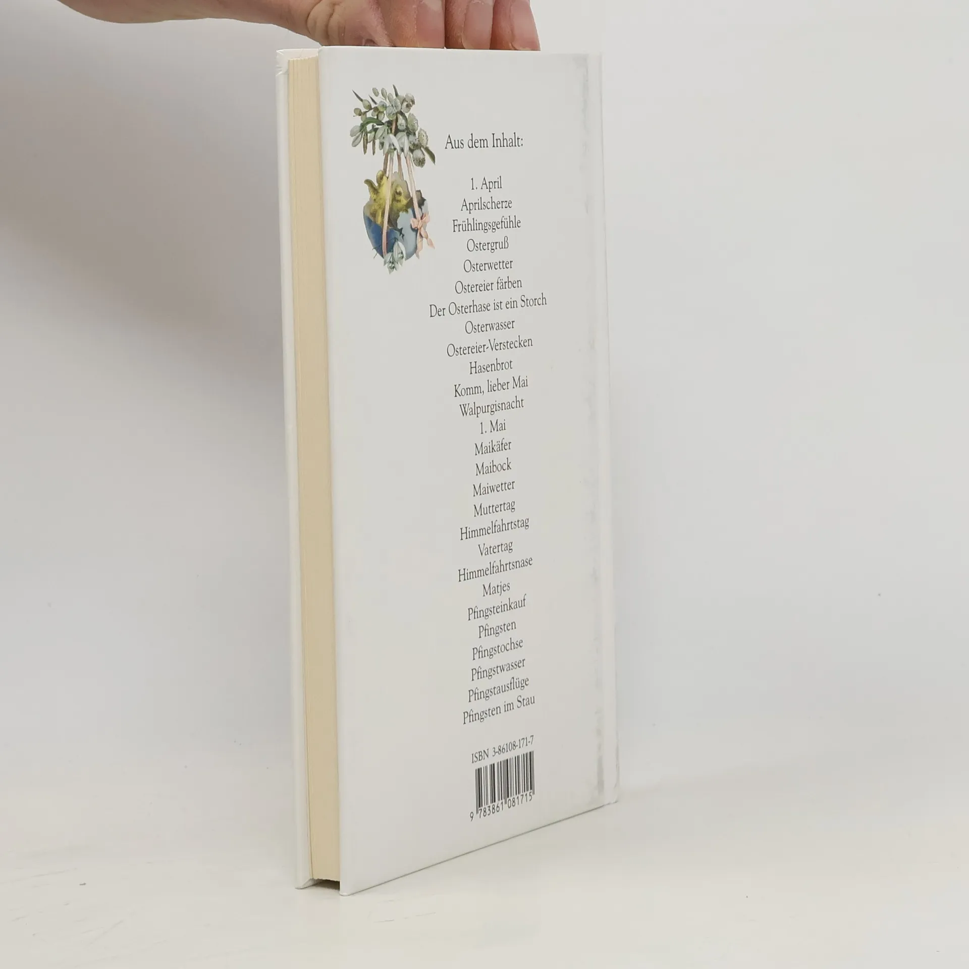Aus dem Inhalt: Wenn Ostern und Pfingsten auf einen Tag fallen; 1. April; Aprilscherze; Frühlingsgefühle I; Frühlingsgefühle II; Haben Sie ein Unterleibchen an?; Judas; Pilatus; Ein Fest leicht abgebremster Freuden; Ostergruß; Osterwetter; Geweihte Ostereier schützen vor Krankheit; Ei; Der Osterhase ist ein Storch; Osterwasser; Ostergeschenke; Asche des Osterfeuers; Hasenbrot; Komm, lieber Mai …; 1. Mai; Wunder; Maikäfer; Maibock; Maiwetter; Muttertag; Himmelfahrtstag; Vatertag; Himmelfahrtsnase; Matjes; Pfingsteinkauf; Pfingsten; Pfingstwasser; Pfingstausflüge; Pfingsten im Stau