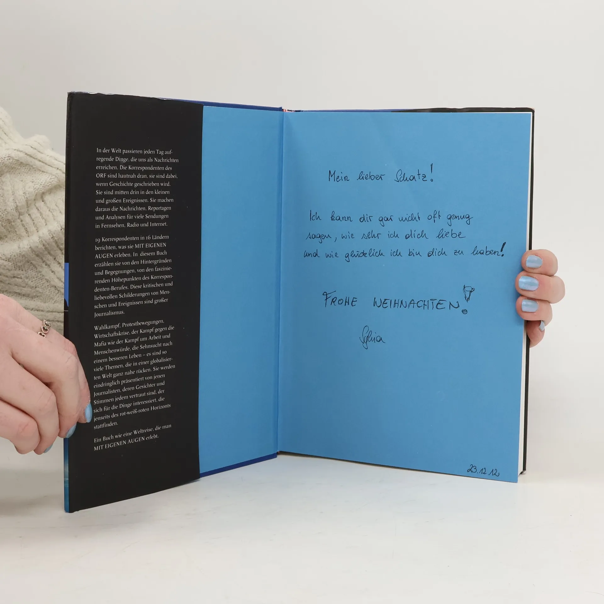 Der im internationalen Maßstab kleine ORF unterhält ein Netz an Auslandskorrespondenten, um das ihn viel größere Rundfunkanstalten beneiden. Aus 16 Metropolen der Welt berichten 25 kompetente Journalistinnen und Journalisten des ORF Tag für Tag in Fernsehen, Radio und Internet. Sie erläutern komplexe Zusammenhänge, ordnen die aktuellen Ereignisse ein und berichten auch spezifisch Österreichisches aus aller Welt nach Hause. In „Mit eigenen Augen“ beschreiben die Auslands-Stars des ORF ihren Arbeitsalltag, erzählen die Geschichten hinter der Geschichte, wie sie sie in den USA, in Moskau, in Tel Aviv, Brüssel, Berlin usw. erleben. „Mit eigenen Augen“ – die Auslandskorrespondenten des ORF zum ersten Mal in einem gemeinsamen Buch. Ein Projekt des Styria Verlages in Kooperation mit dem ORF, herausgegeben von Roland Adrowitzer, Leiter des ORF–Korrespondentenbüros.