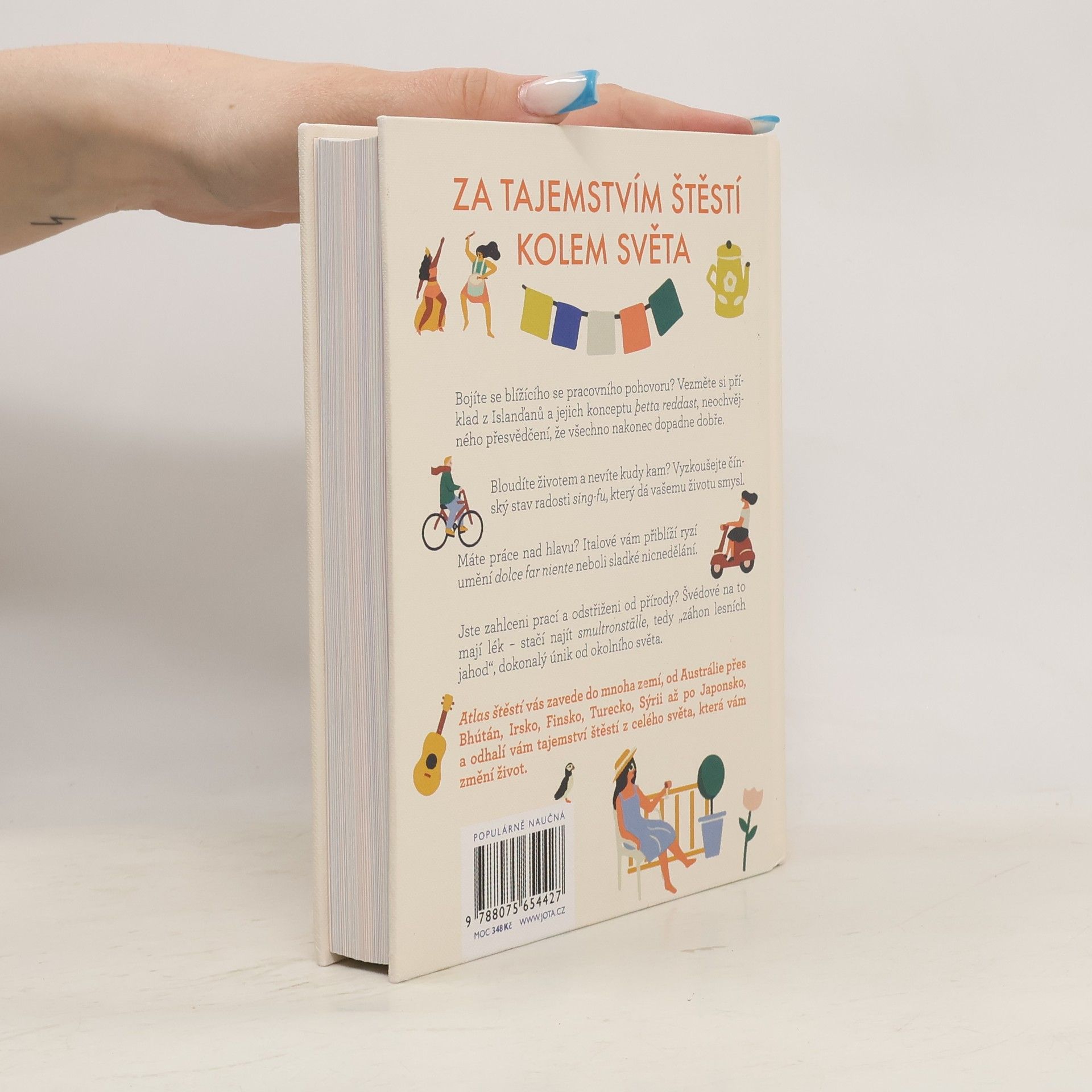 Cesta kolem světa a 33 mezinárodních návodů, jak dosáhnout štěstí. Bojíte se blížícího se pracovního pohovoru? Vezměte si příklad z Islanďanů a jejich konceptu þetta reddast, neochvějného přesvědčení, že všechno nakonec dopadne dobře.Bloudíte životem a nevíte kudy kam? Vyzkoušejte čínský stav radosti sing-fu, který dá vašemu životu smysl.Máte práce nad hlavu? Italové vám přiblíží ryzí umění dolce far niente neboli sladké nicnedělání.Jste zahlceni prací a odstřiženi od přírody? Švédové na to mají lék – stačí najít smultronställe, tedy „záhon lesních jahod“, dokonalý únik od okolního světa.Atlas štěstí vás zavede do mnoha zemí, od Anglie přes Bhútán, Irsko, Finsko, Turecko, Sýrii až po Japonsko a odhalí vám taje štěstí z celého světa, které vám změní život.