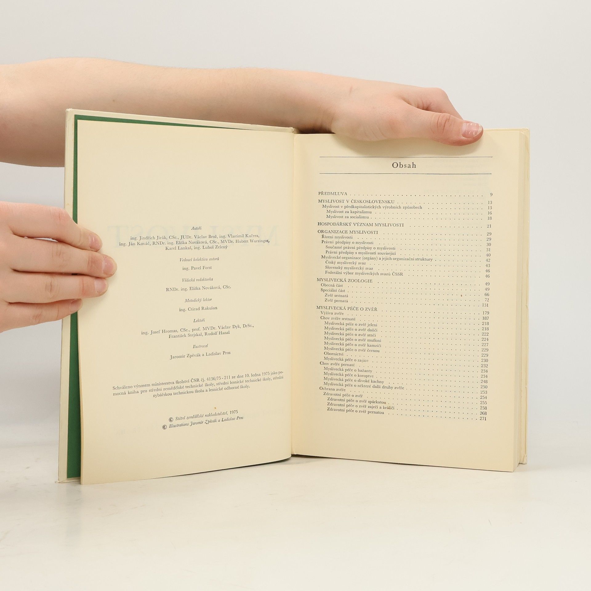 Myslivost v Československu - Hospodářský význam myslivosti - Organizace myslivosti - Myslivecká zoologie - Myslivecká péče o zvěř - Stopařství - Lov a zužitkování zvěře - Myslivecké mravy, zvyklosti a obyčeje - Lovecké střelectví - Myslivecká kynologie 54 tabulek, 213 obrázků, 24 barevných příloh