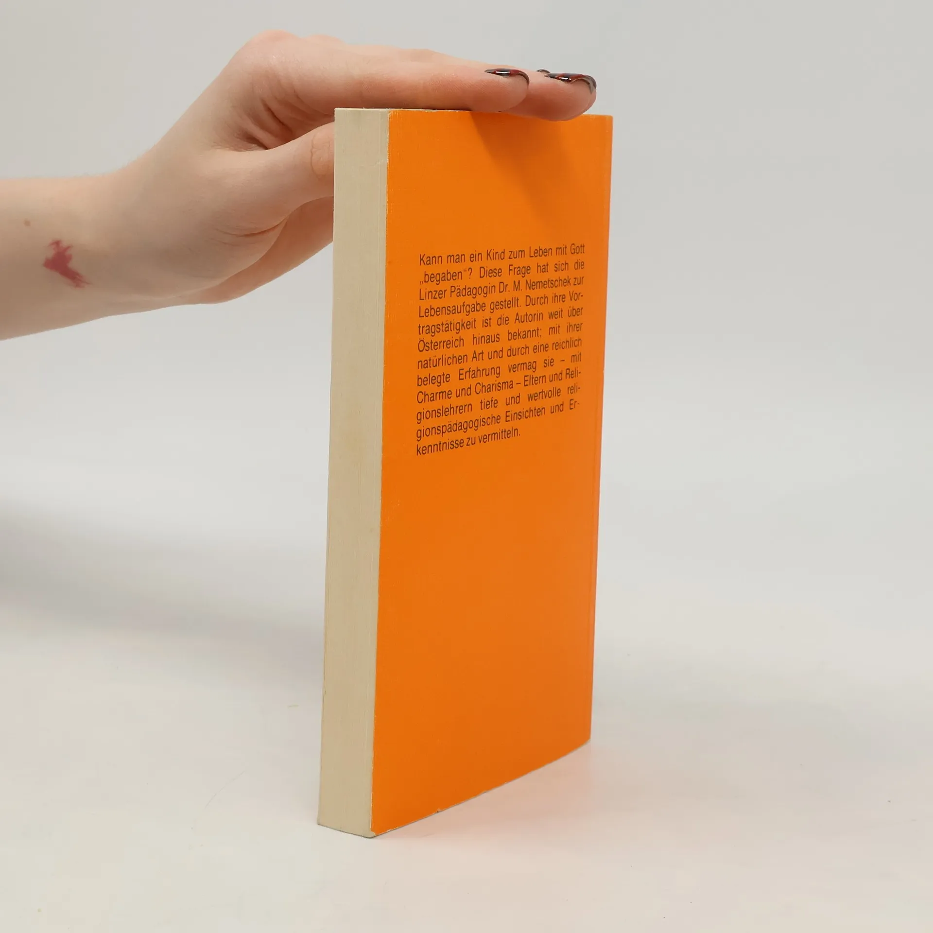 Kann man ein Kind zum Leben mit Gott „begaben?“ Diese Frage hat sich die Linzer Pädagogin Dr. M. Nemetschek zur Lebensaufgabe gestellt. Durch ihre Vortragstätigkeit ist die Autorin weit über Österreich hinaus bekannt; mit ihrer natürlichen Art und durch eine reichlich belegte Erfahrung vermag sie Eltern und Religionslehrern tiefe und wertvolle religionspädagogische Einsichten und Erkenntnisse zu vermitteln.