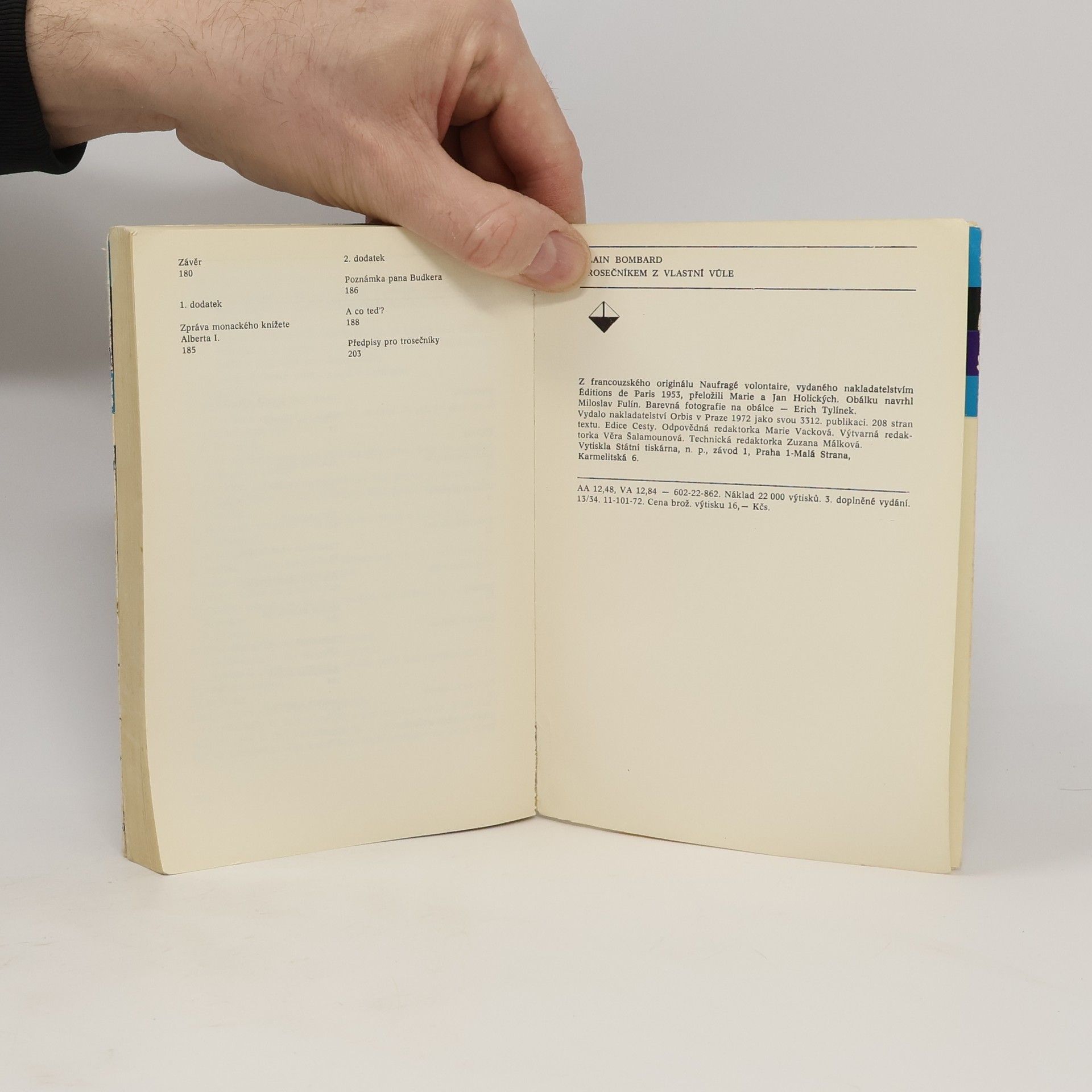 Již ve třetím, doplněném vydání vyšla známá knížka francouzského lékaře, který svým odvážným pokusem o překonání strachu při ztroskotání lodi dokázal, že i v takovém případě je možno přežít. Původní text doplnil přehledem nejrůznějších výzkumů, pokusů a opatření, která byla podniknuta v posledních letech pro záchranu trosečníků. Francouzský lékař Alain Bombard zjistil po zevrubném studiu, že trosečníci neumíraji na nedostatek jídla a vody, ale na následky psychického stavu. Jeho teorii nikdo neuvěřil. Aby ji dokázal, vydal se na dvouměsíční cestu po moři z Monte Carla přes Kanárské ostrovy na Antily. Své poznatky jak somatické, tak oceánografické zpracoval knižně. Fotografie, grafy a mapa zpřístupňují text.