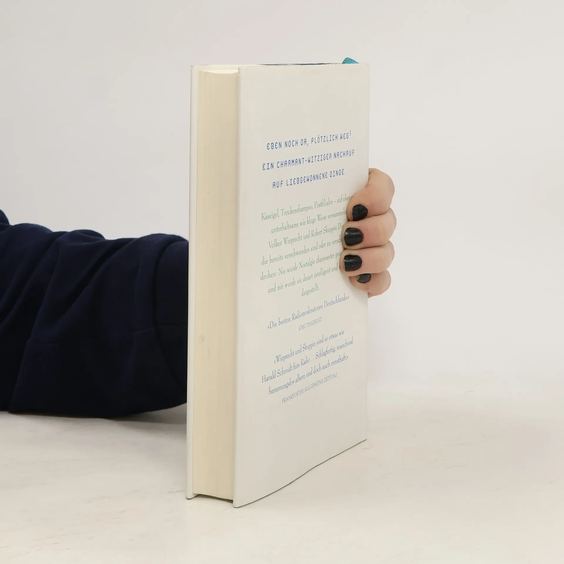 Eben noch da, plötzlich weg! Ein charmant-witziger Nachruf auf liebgewonnene Dinge. Käseigel, Trockenshampoo, Postfilialen – auf ebenso unterhaltsame wie kluge Weise versammeln Volker Wieprecht und Robert Skuppin Dinge, die bereits verschwunden sind oder zu verschwinden drohen: Nie wurde Nostalgie charmanter präsentiert, und nie wurde sie derart intelligent und witzig dargestellt. «Die besten Radiomoderatoren Deutschlands.» Jörg Thadeusz «Wieprecht undSkuppin sind so etwas wie Harald Schmidt fürs Radio .. Schlagfertig, manchmal hemmungslos albern und doch auch ernsthaft.» Frankfurter Allgemeine Zeitung