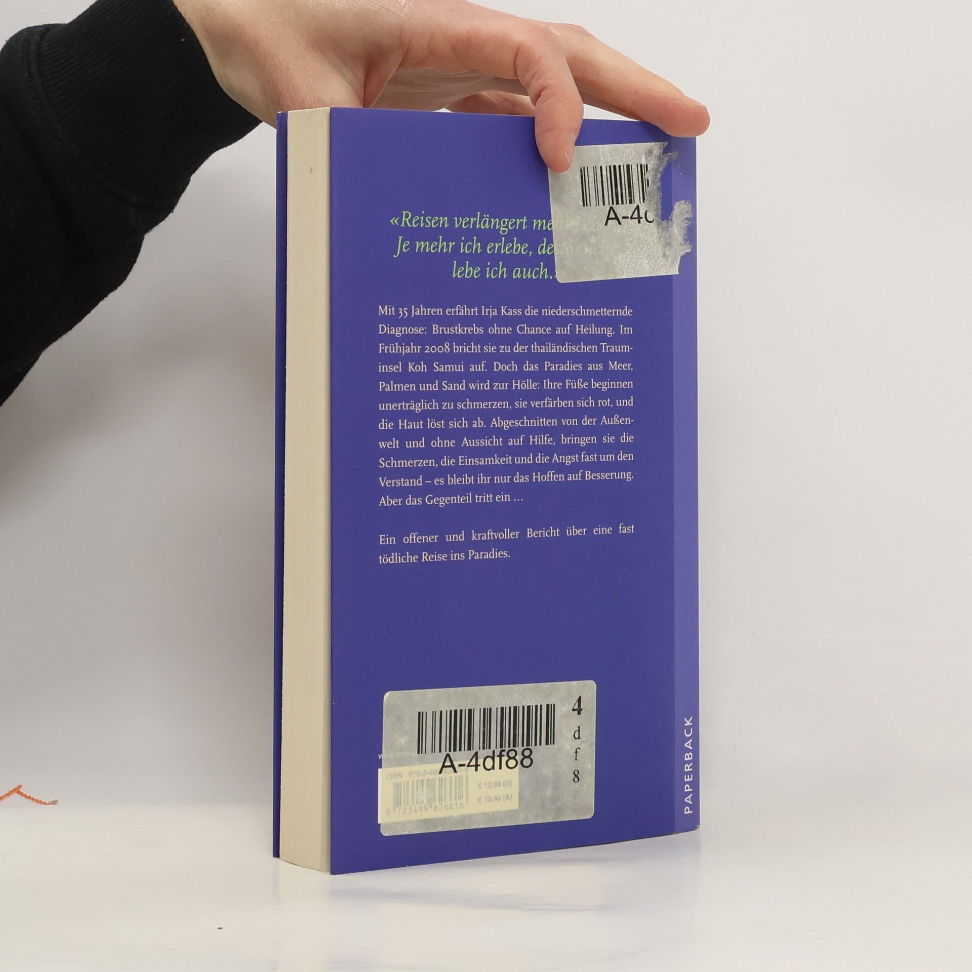 «Reisen verlängert mein Leben: Je mehr ich erlebe, desto mehr lebe ich auch.» Mit 35 Jahren erfährt Irja Kass die niederschmetternde Diagnose: Brustkrebs ohne Chance auf Heilung. Im Frühjahr 2008 bricht sie zu der thailändischen Traum-insel Koh Samui auf. Doch das Paradies aus Meer, Palmen und Sand wird zur Hölle: Ihre Füße beginnen unerträglich zu schmerzen, sie verfärben sich rot, und die Haut löst sich ab. Abgeschnitten von der Außen-welt und ohne Aussicht auf Hilfe, bringen sie die Schmerzen, die Einsamkeit und die Angst fast um den Verstand – es bleibt ihr nur das Hoffen auf Besserung. Aber das Gegenteil tritt ein ... Ein offener und kraftvoller Bericht über eine fast tödliche Reise ins Paradies.