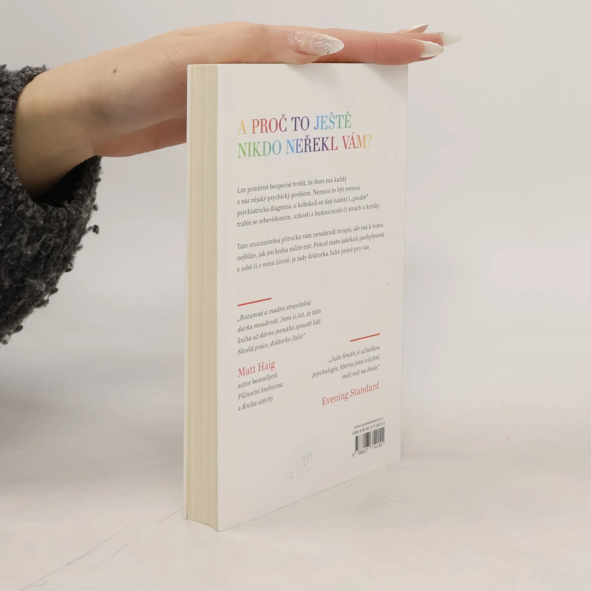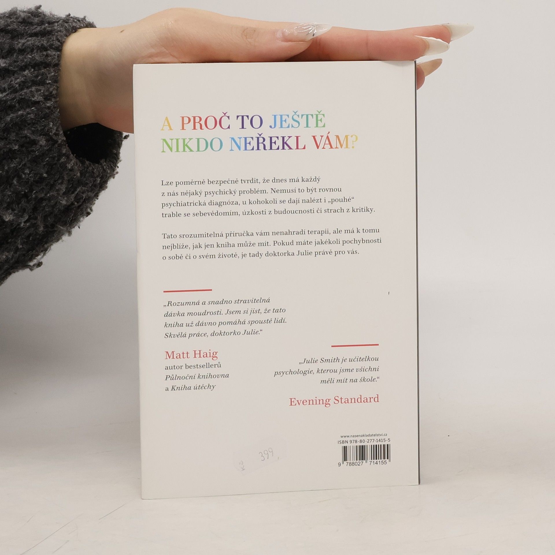 Kniha Proč mi tohle nikdo neřekl dřív? vás naučí, jak posílit své psychické zdraví a udržet si ho i v těch nejnáročnějších obdobích. Odborné rady doktorky Julie Smith a účinné copingové techniky vám pomohou zachovat vaši odolnost, ať už se chcete vyrovnat s úzkostmi, s kritikou, s depresí, vybudovat si sebejistotu, nalézt motivaci nebo se naučit odpouštět sami sobě.Na základě dlouholetých zkušeností s klinickou psychologií se autorka dělí o všechny dovednosti, které potřebujete, abyste zvládli životní vzestupy a pády.Tato kniha je plná tajemství z terapeutovy sady nástrojů a je nezbytnou příručkou pro optimalizaci duševního zdraví. Jednoduché, ale odborné rady doktorky Julie a účinné techniky zvládání vám pomohou zůstat odolní bez ohledu na to, co vám život postaví do cesty.Kniha je napsána v krátkých heslech, takže můžete přejít rovnou na tu část, kterou potřebujete, podle toho, jakému problému právě čelíte – a okamžitě najít vhodné nástroje, které vám pomohou.
