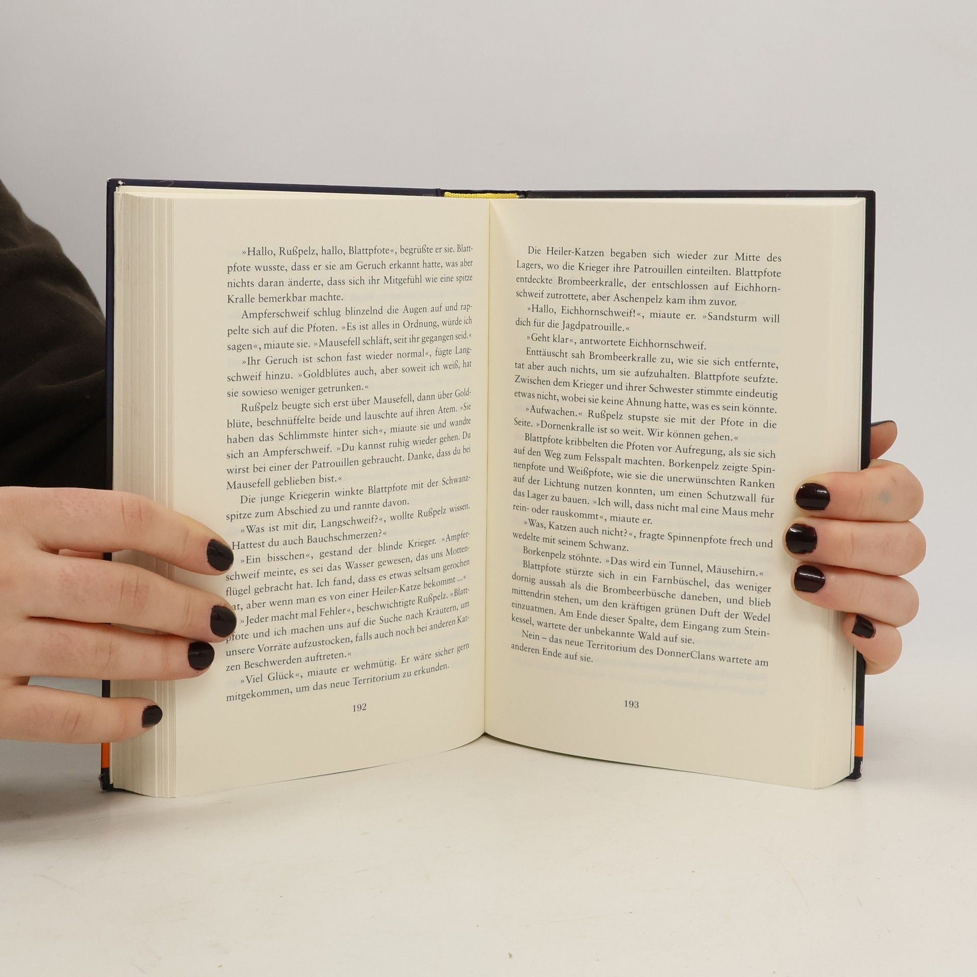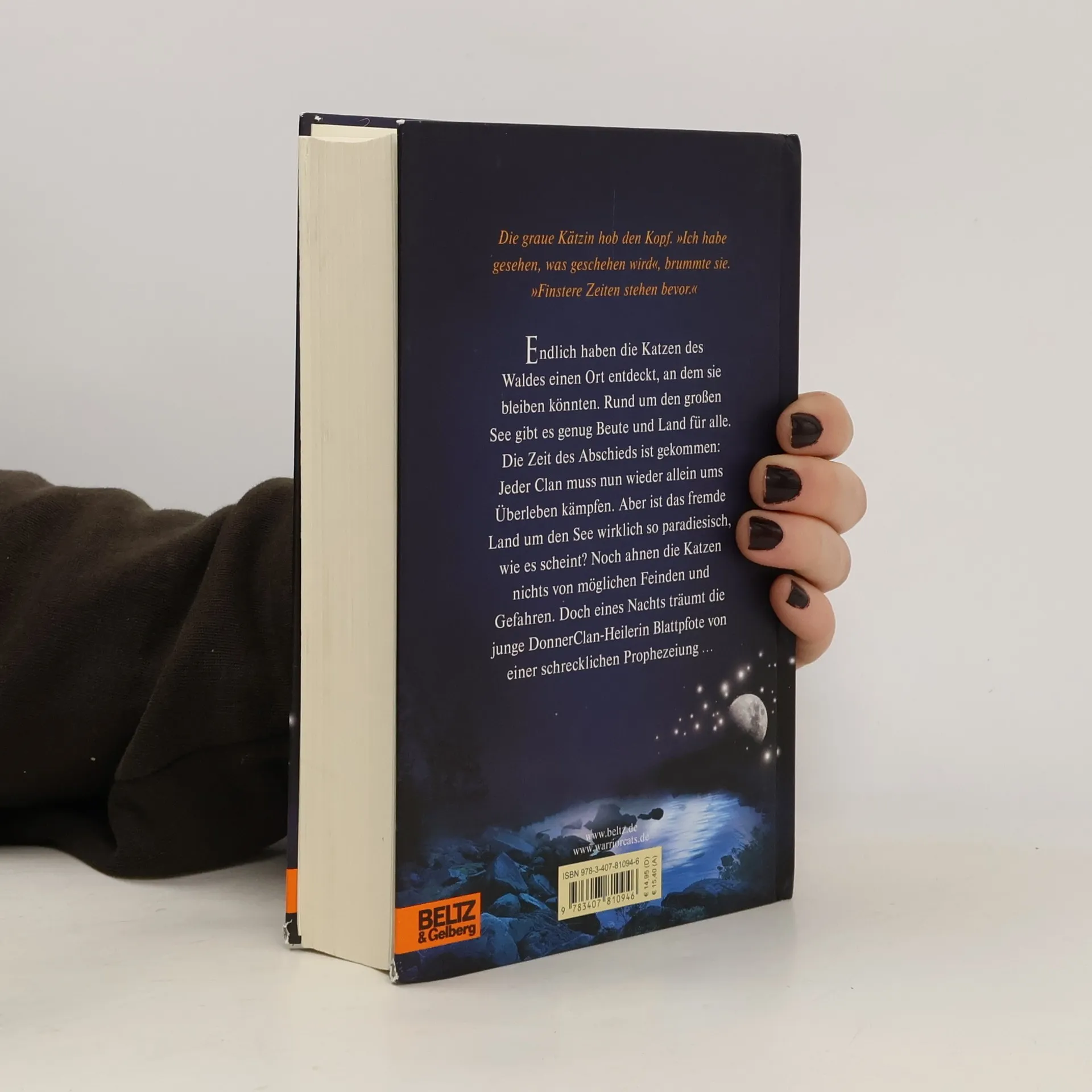 Die graue Kätzin hob den Kopf. 'Ich habe gesehen, was geschehen wird. Finstere Zeiten stehen bevor.' Endlich, nach langer Reise, haben die Katzen des Waldes einen Ort entdeckt, an dem sie bleiben könnten! Rund um den großen See gibt es genug Beute und Land für alle. Die Zeit des Abschieds für die große Reisegemeinschaft scheint gekommen. Jeder Clan muss nun wieder allein für sich selbst und das eigene Überleben kämpfen. Aber ist dies auch wirklich das Ziel ihrer Reise, die neue Heimat? Der SternenClan schweigt – ohne Zeichen der Kriegerahnen bleibt die Zukunft der Katzen ungewiss. Doch dann träumt die junge DonnerClan-Heilerin Blattpfote von einer schrecklichen Prophezeiung: 'Blut wird Blut vergießen und das Wasser des Sees rot färben, erst dann kehrt Frieden ein.'