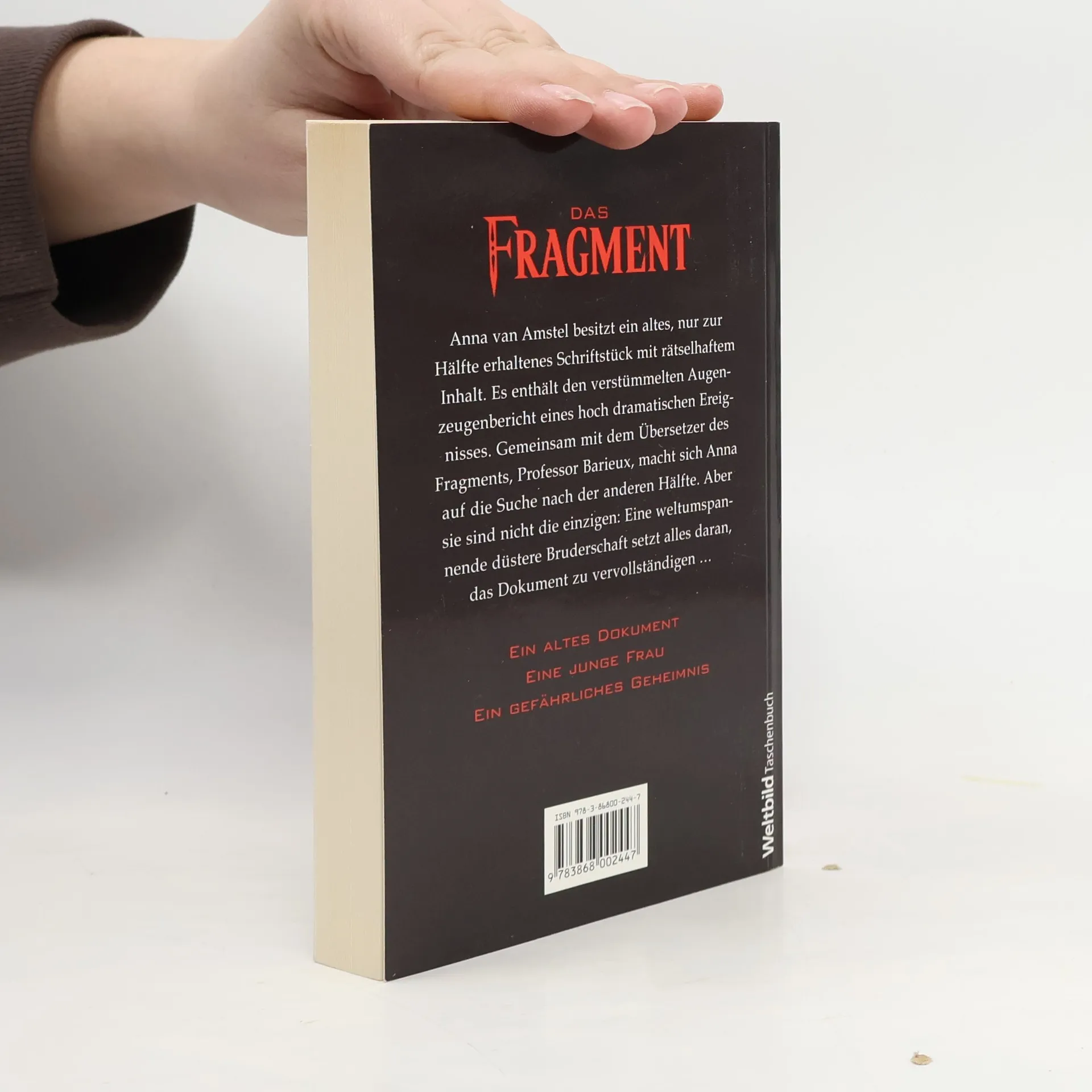 Eine alte Schrift, ein gefährliches Geheimnis Anna van Amstel kommt zu einem nur zur Hälfte erhaltenen Schriftstück. Der Inhalt gibt ihr und Professor Barieux, dem Übersetzer, Rätsel auf. Gemeinsam machen sie sich auf die Suche nach der anderen Hälfte. Doch auch eine gefährliche Bruderschaft jagt dem geheimnisvollen Fragment hinterher.