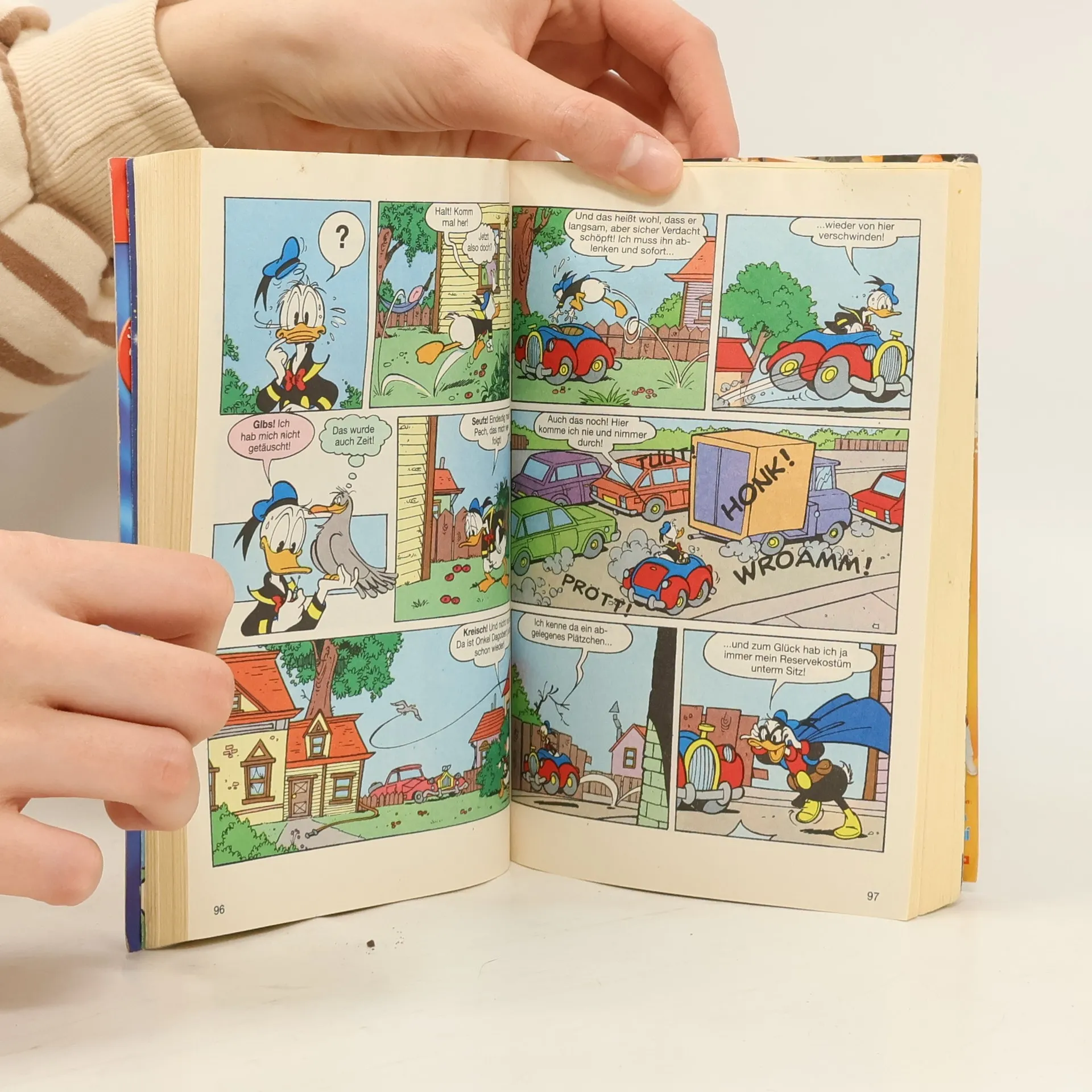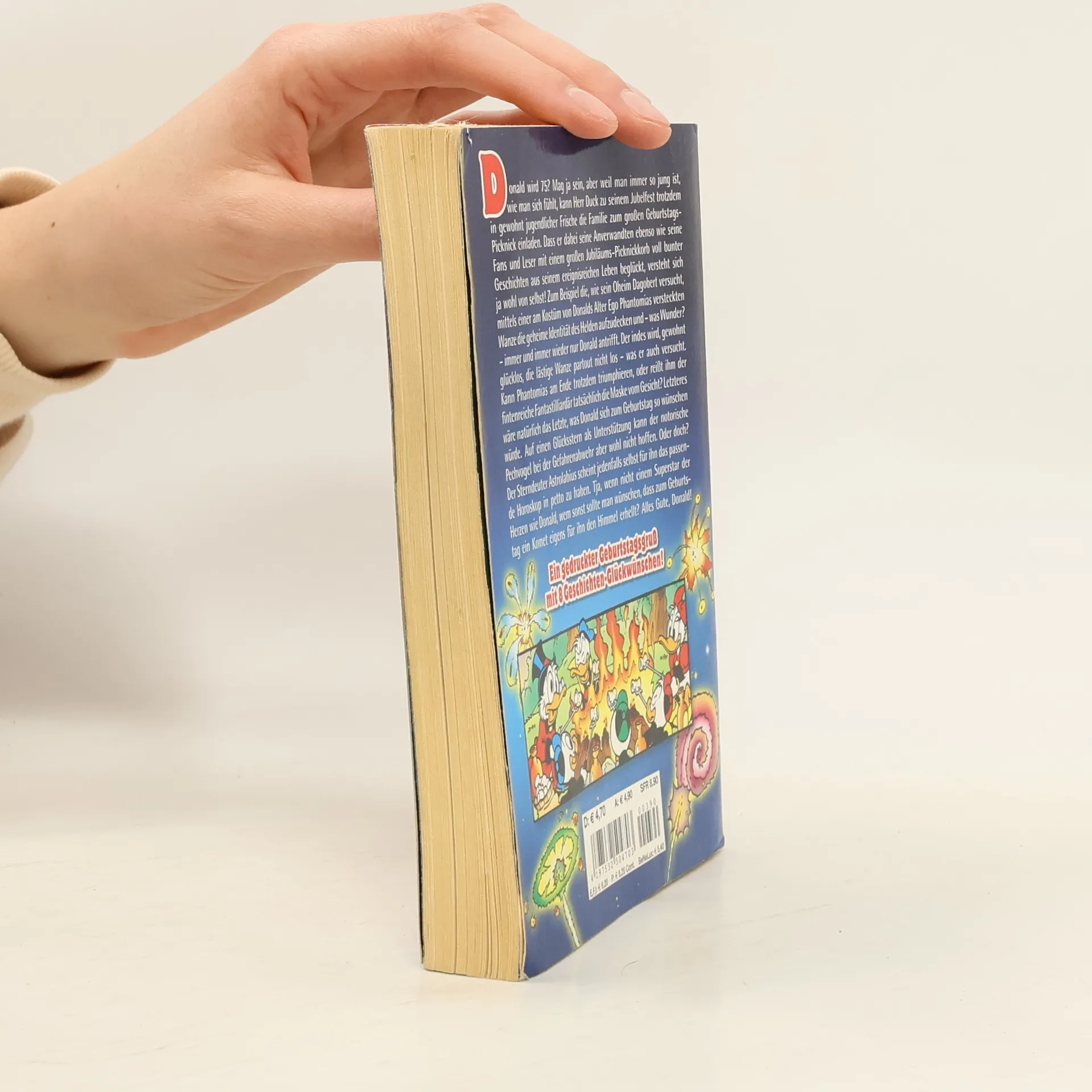 Donald wird 75? Mag ja sein, aber weil man immer so jung ist, wie man sich fühlt, kann Herr Duck zu seinem Jubelfest trotzdem in gewohnt jugendlicher Frische die Familie zum großen Geburtstags- Picknick einladen. Dass er dabei seine Anverwandten ebenso wie seine Fans und Leser mit einem großen Jubiläums-Picknickkorb voll bunter Geschichten aus seinem ereignisreichen Leben beglückt, versteht sich ja wohl von selbst!Zum Beispiel die, wie sein Oheim Dagobert versucht, mittels einer am Kostüm von Donalds Alter Ego Phantomias versteckten Wanze die geheime Identität des Helden aufzudecken und – was Wunder? – immer und immer wieder nur Donald antrifft. Der indes wird, gewohnt glücklos, die lästige Wanze partout nicht los – was er auch versucht. Kann Phantomias am Ende trotzdem triumphieren, oder reißt ihm der fintenreiche Fantastilliardär tatsächlich die Maske vom Gesicht? Letzteres wäre natürlich das Letzte, was Donald sich zum Geburtstag so wünschen würde.Auf einen Glücksstern als Unterstützung kann der notorische Pechvogel bei der Gefahrenabwehr aber wohl nicht hoffen. Oder doch? Der Sterndeuter Astrolabius scheint jedenfalls selbst für ihn das passende Horoskop in petto zu haben. Tja, wenn nicht einem Superstar der Herzen wie Donald, wem sonst sollte man wünschen, dass zum Geburtstag ein Komet eigens für ihn den Himmel erhellt? Alles Gute, Donald!Ein gedruckter Geburtstagsgruß mit 9 Geschichten-Glückwünschen!
