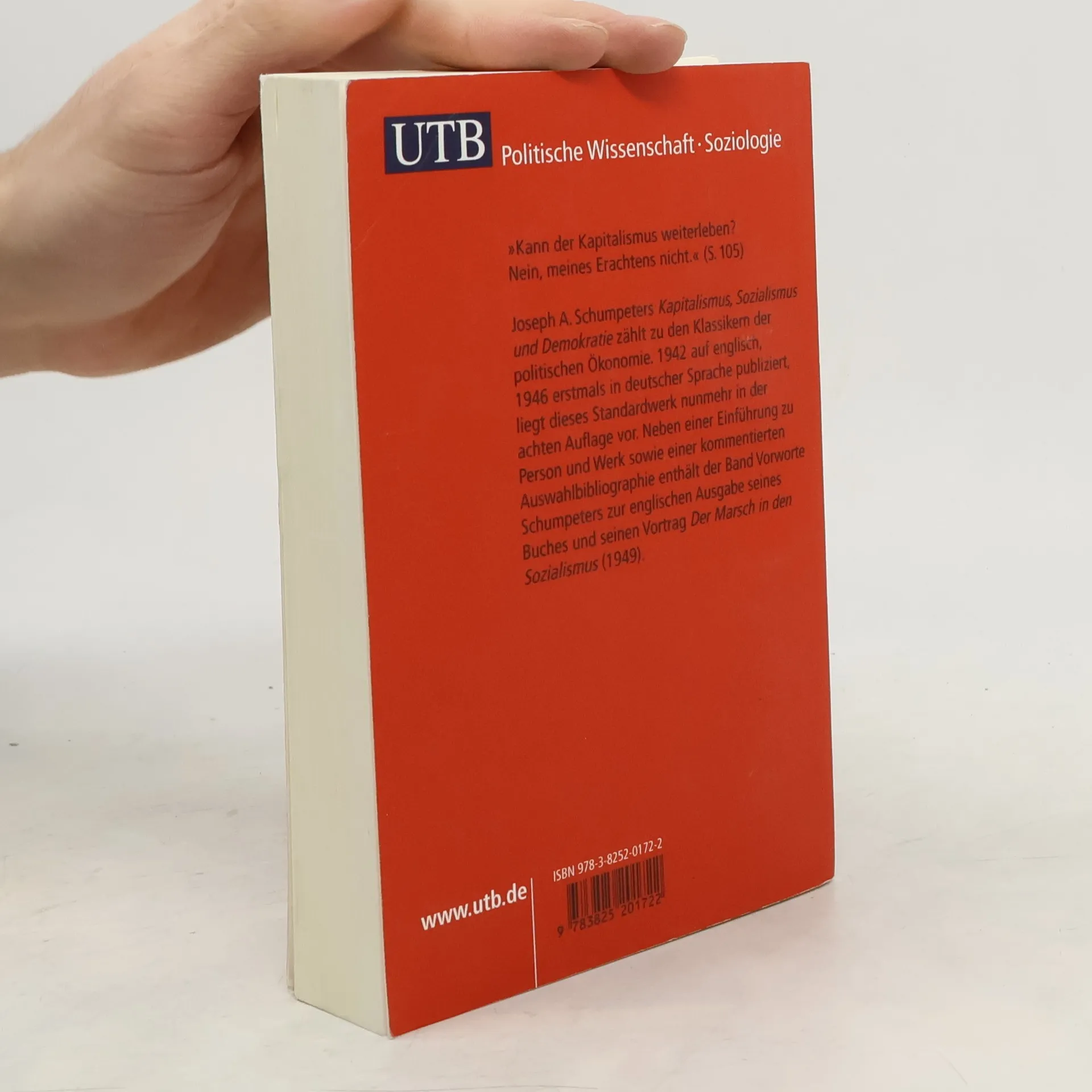 „Kann der Kapitalismus weiterleben? Nein, meines Erachtens nicht.“ (S. 105) Joseph A. Schumpeters Kapitalismus, Sozialismus und Demokratie zählt zu den Klassikern der politischen Ökonomie. 1942 auf englisch, 1946 erstmals in deutscher Sprache publiziert, liegt dieses Standardwerk nunmehr in der achten Auflage vor. Neben einer Einführung zu Person und Werk sowie einer kommentierten Auswahlbibliographie enthält der Band Vorworte Schumpeters zur englischen Ausgabe seines Buches und seinen Vortrag Der Marsch in den Sozialismus (1949).