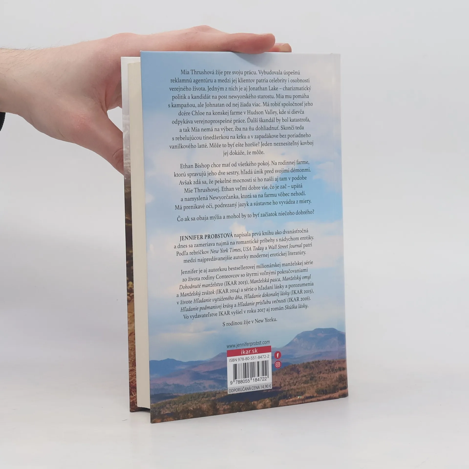 Šťastie často býva tam, kde ho nik nehľadáMia Thrushová žije pre svoju prácu. Od piky vybudovala úspešnú PR agentúru a medzi jej klientov patria celebrity i osobnosti verejného života. Jedným z nich je aj Jonathan Lake – charizmatický politik a kandidát na post newyorského starostu. Mia mu pomáha s kampaňou, ale Johnatan od nej žiada viac. Má robiť spoločnosť jeho dcére Chloe na konskej farme v Hudson Valley, kde si dievča odpykáva verejnoprospešné práce. Ďalší škandál by bol katastrofa, a tak Mia nemá na výber, iba na ňu dohliadnuť. Skončí teda s rebelujúcou tínedžerkou na krku a v zapadákove bez poriadneho vanilkového latté. Môže to byť ešte horšie? Jeden neznesiteľný kovboj jej dokáže, že môže.Ethan Bishop chce mať od všetkého pokoj. Na rodinnej farme, ktorú spravujú jeho dve sestry, hľadá únik pred vnútornými démonmi. No zdá sa, že pekelné mocnosti si ho našli aj tam v podobe Mie Thrushovej. Ethan veľmi dobre vie, čo je zač – upätá a namyslená Newyorčanka, ktorá sa na farmu vôbec nehodí. Navyše má prenikavé oči, podrezaný jazyk a sústavne ho vyvádza z miery.No čo ak sa obaja mýlia a mohol by to byť aj začiatok niečoho dobrého?