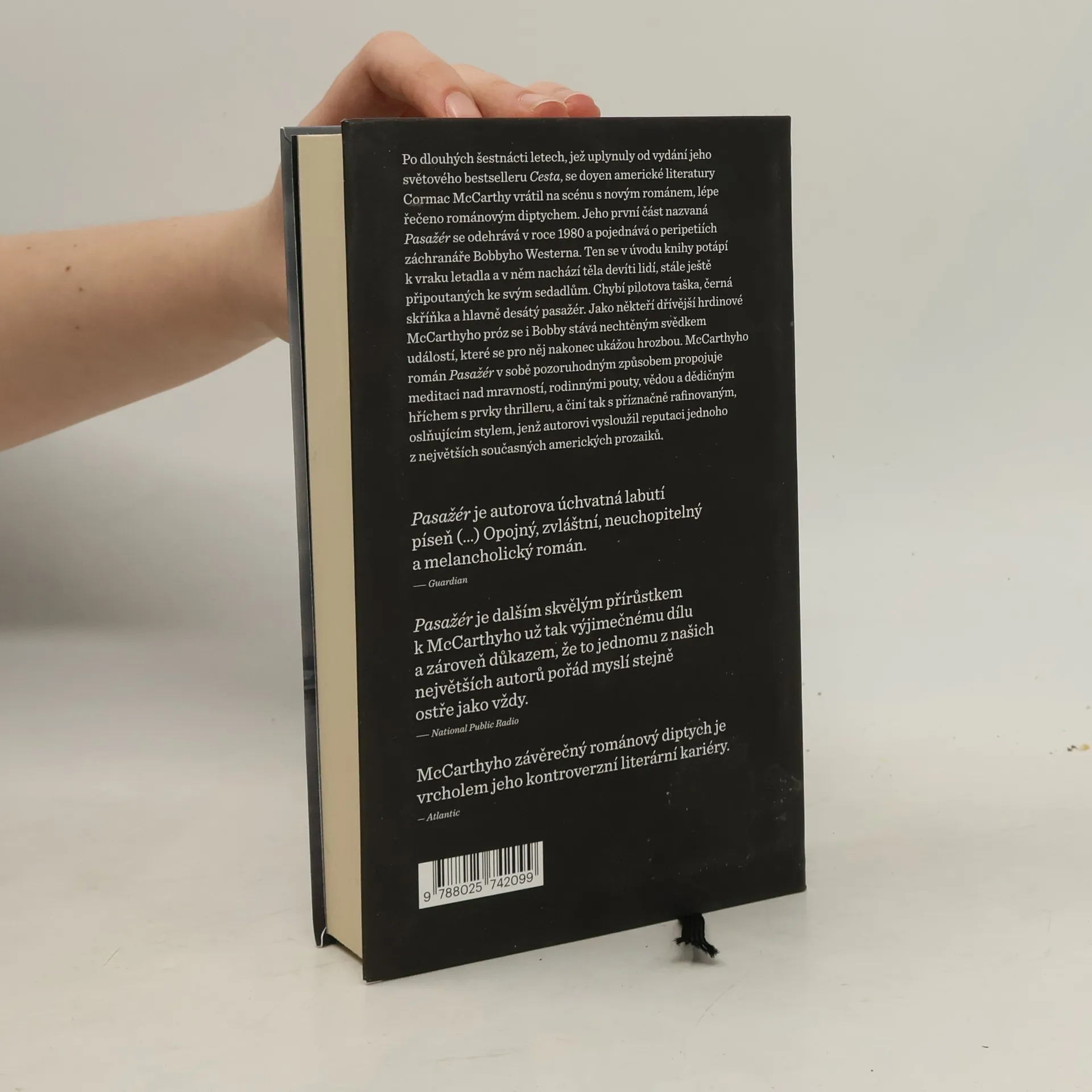 Po dlouhých šestnácti letech, jež uplynuly od vydání jeho světového bestselleru Cesta, se žijící klasik americké literatury Cormac McCarthy vrací na scénu s novým dílem. Jeho román Pasažér se odehrává v roce 1980 a sleduje osudy záchranáře Bobbyho Westerna, který se z člunu pobřežní hlídky vrhá k potopenému vraku letadla. V něm nachází těla devíti lidí, stále ještě připoutaných ke svým sedadlům. Chybí pilotova taška, černá skříňka a hlavně desátý pasažér. Jako někteří dřívější hrdinové McCarthyho románů se i Bobby Western stává nechtěným svědkem událostí, které se pro něj nakonec ukážou hrozbou. McCarthyho román Pasažér v sobě pozoruhodným způsobem propojuje meditaci nad mravností, vědou a dědičným hříchem s prvky thrilleru, a činí tak s příznačně rafinovaným, oslňujícím stylem, jenž autorovi vysloužil reputaci jednoho z největších současných amerických prozaiků.