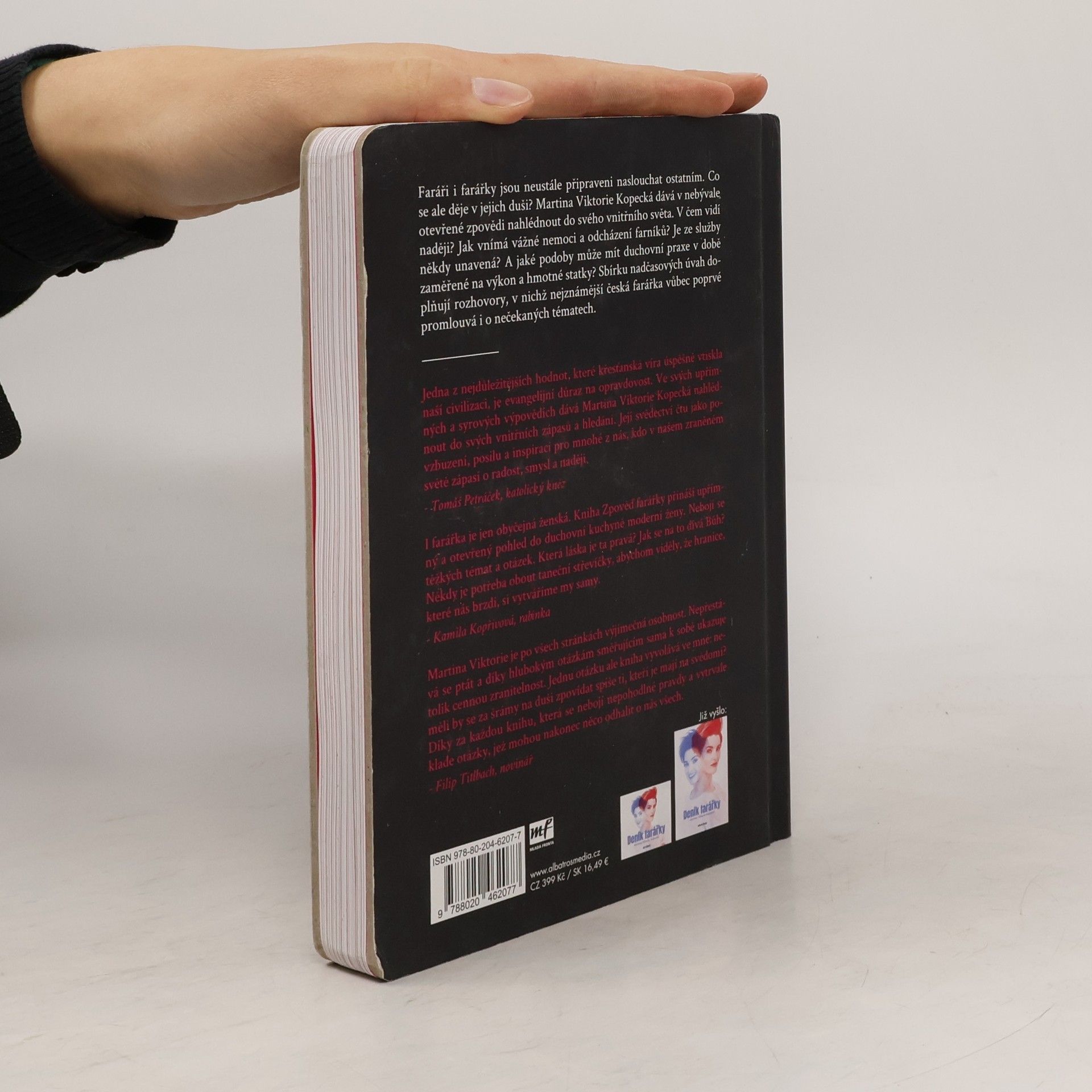 O životě farářky už jste četli. Teď se připravte na cestu do jejího nitra. Faráři i farářky jsou neustále připraveni naslouchat ostatním. Co se ale děje v jejich duši? Martina Viktorie Kopecká dává v nebývale otevřené zpovědi nahlédnout do svého vnitřního světa. Co si myslí o celibátu a založení rodiny? Jak vnímá vážné nemoci a odcházení svých farníků? Je ze služby někdy unavená? A jaké podoby může mít duchovní praxe v době zaměřené na výkon a hmotné statky? Sbírku nadčasových úvah doplňují rozhovory, v nichž nejznámější česká farářka vůbec poprvé promlouvá i o nečekaných tématech.