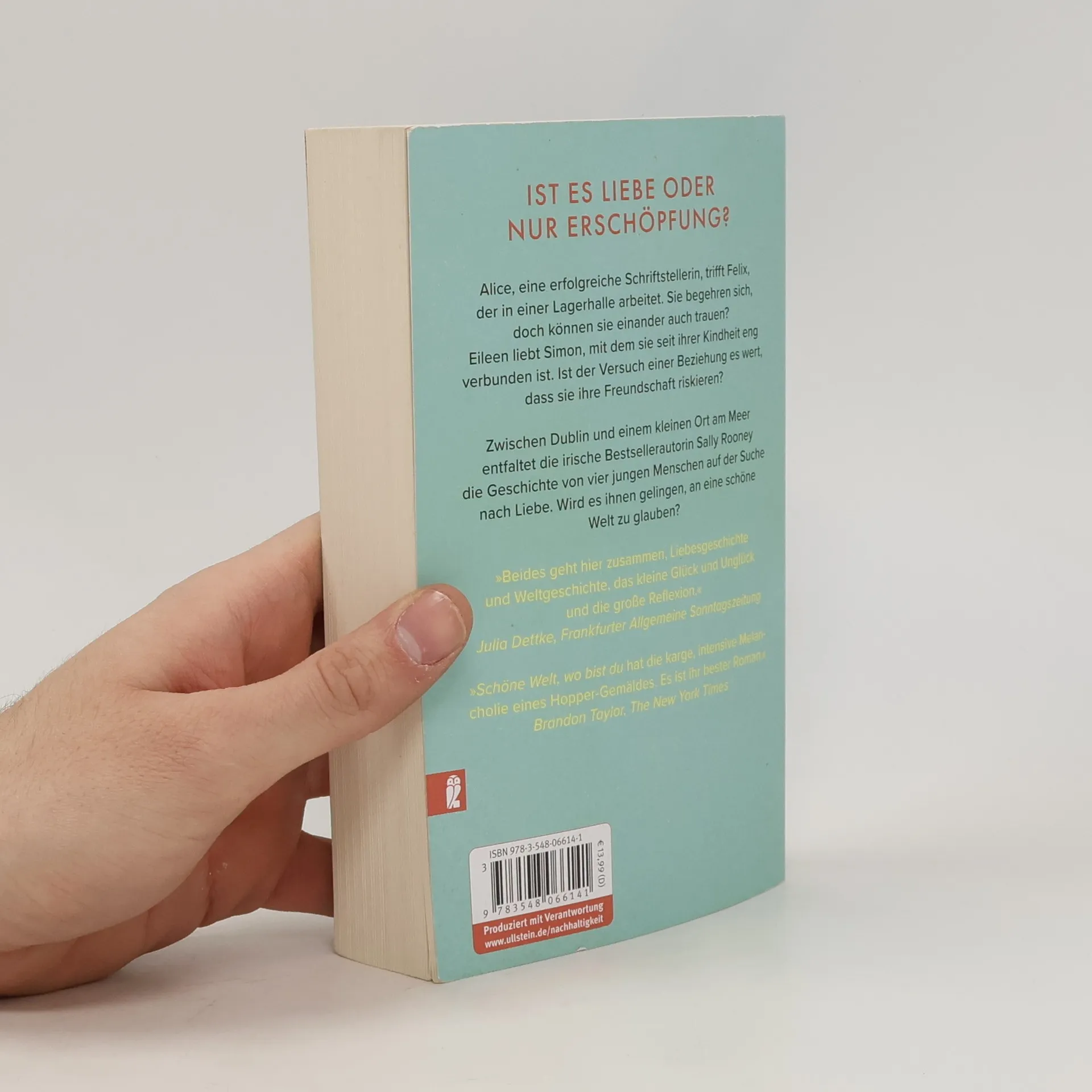 »Schöne Welt, wo bist du hat die karge, intensive Melancholie eines Hopper-Gemäldes. Ihr bester Roman.« Brandon Taylor, The New York Times Alice trifft Felix. Sie ist eine erfolgreiche Schriftstellerin, er arbeitet entfremdet in einer Lagerhalle. Sie begehren einander, doch können sie einander auch trauen? Alices beste Freundin Eileen hat eine schmerzvolle Trennung hinter sich und fühlt sich aufs Neue zu Simon hingezogen, mit dem sie seit ihrer Kindheit eng verbunden ist. Sie lieben sich, doch ist der Versuch einer Beziehung den Verlust ihrer Freundschaft wert? Zwischen Dublin und einem kleinen Ort an der irischen Küste entfaltet Sally Rooney eine Geschichte von vier jungen Menschen, die sich nahe sind, die einander verletzen, die sich austauschen: über Sex, über Ungleichheit und was sie mit Beziehungen macht, über die Welt, in der sie leben. Schöne Welt, wo bist du ist eine universelle Geschichte über den Raum zwischen Alleinsein und Einsamkeit und über die Freiheit, sein Leben mit anderen zu teilen – überwältigend klug, voller Klarheit und Trost.