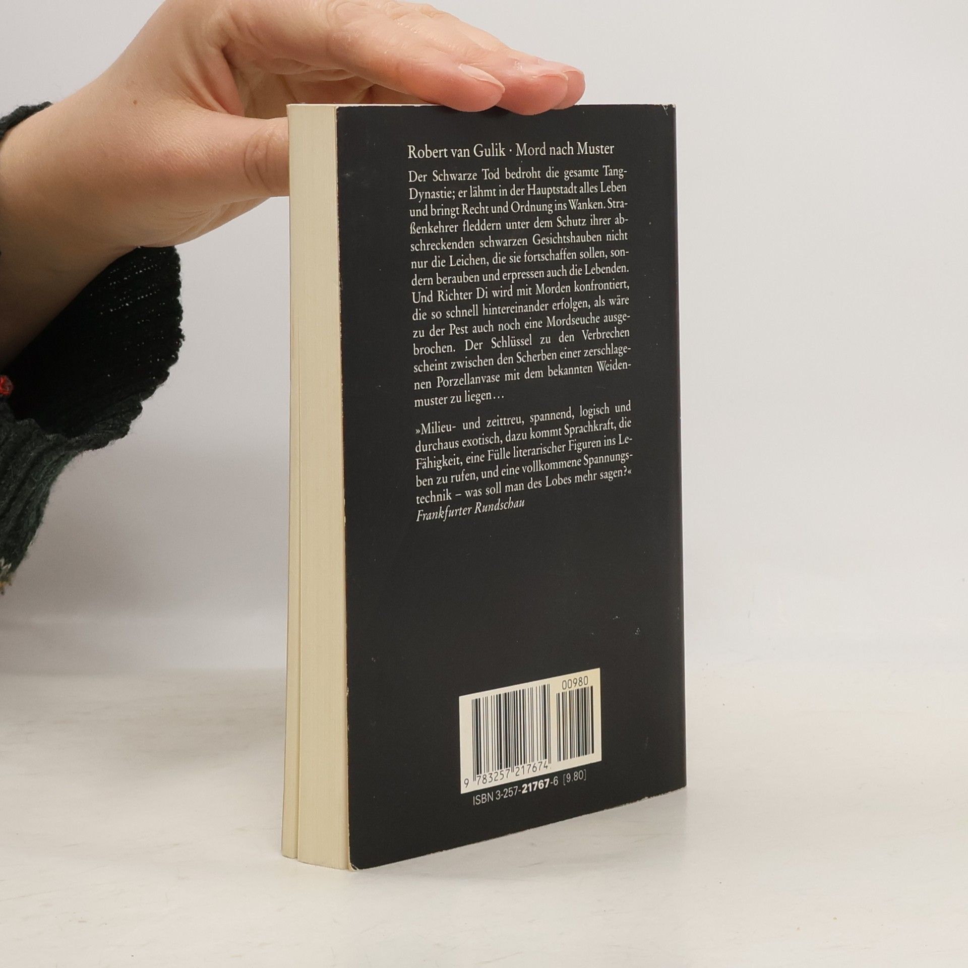Der Schwarze Tod bedroht die gesamte Tang-Dynastie; er lähmt in der Hauptstadt alles Leben und bringt Recht und Ordnung ins Wanken. Und Richter Di wird mit Morden konfrontiert, die so schnell hintereinander erfolgen, als wäre zu der Pest auch eine Mordseuche ausgebrochen. Der Schlüssel zu den Verbrechen scheint zwischen den Scherben einer zerschlagenen Porzellanvase zu liegen.