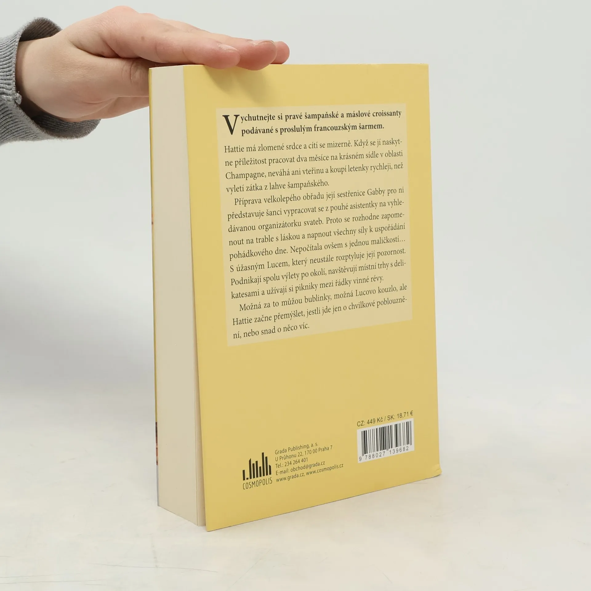 Vychutnejte si pravé šampaňské a máslové croissanty podávané s proslulým francouzským šarmemHattie má zlomené srdce a cítí se mizerně. Když se jí naskytne příležitost pracovat dva měsíce na krásném sídle v oblasti Champagne, neváhá ani vteřinu a koupí letenky rychleji, než vyletí zátka z lahve šampaňského.Příprava velkolepého obřadu její sestřenice Gabby pro ni představuje šanci vypracovat se z pouhé asistentky na vyhledávanou organizátorku svateb. Proto se rozhodne zapomenout na trable s láskou a napnout všechny síly k uspořádání pohádkového dne. Nepočítala ovšem s jednou maličkostí… S úžasným Lucem, který neustále rozptyluje její pozornost. Podnikají spolu výlety po okolí, navštěvují místní trhy s delikatesami a užívají si pikniky mezi řádky vinné révy.Možná za to můžou bublinky, možná Lucovo kouzlo, ale Hattie začne přemýšlet, jestli jde jen o chvilkové poblouznění, nebo snad o něco víc.