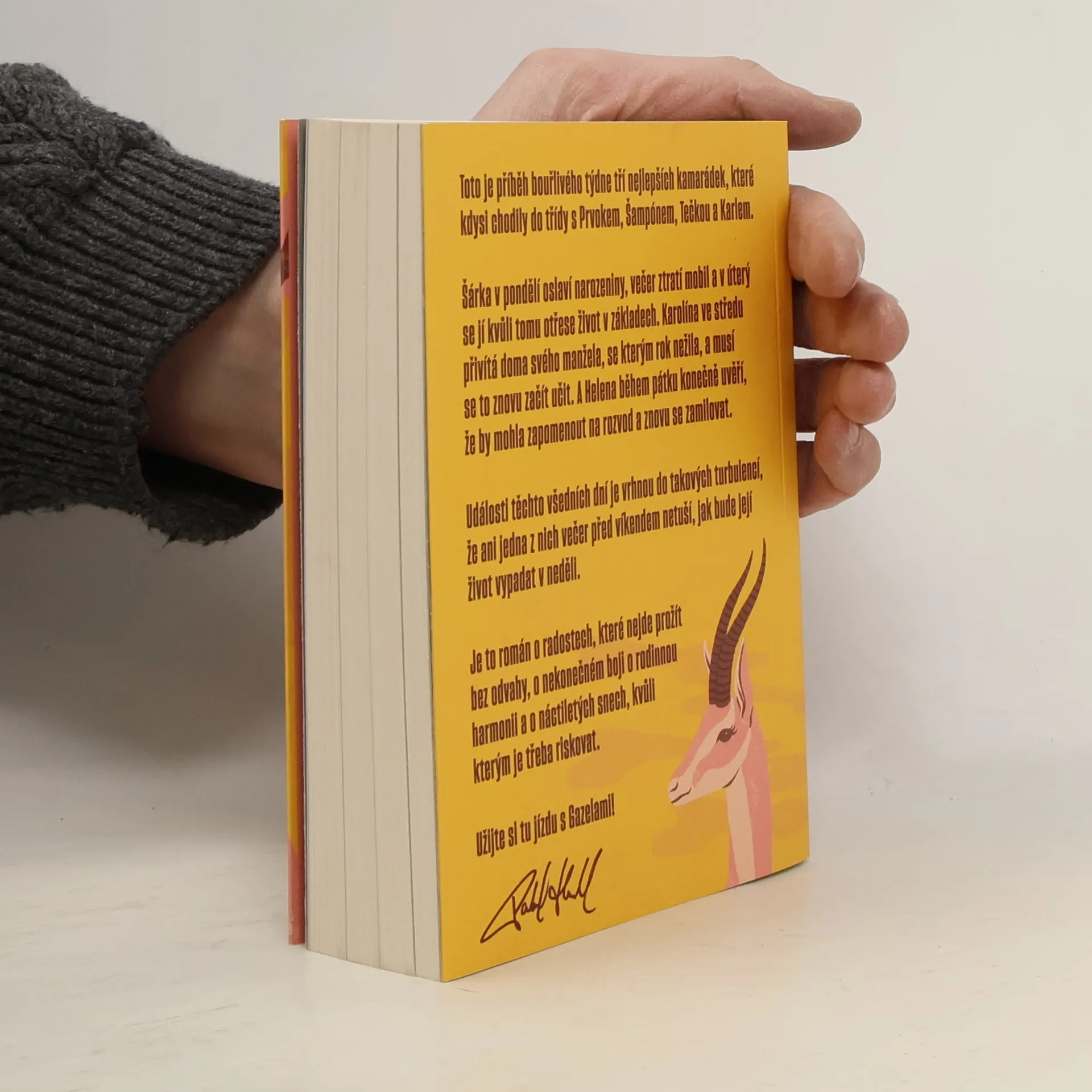 Gazely vypráví příběh jednoho bouřlivého týdne tří blízkých kamarádek, které kdysi chodily do školy s Prvokem, Šampónem, Tečkou a Karlem. Šárka začíná týden narozeninovou oslavou, ale ztráta mobilu jí už v úterý převrátí život naruby. Karolína se ve středu setkává se svým manželem, se kterým po roce odloučení zkouší obnovit vztah. Helena v pátek zjišťuje, že by mohla nechat rozvod za sebou a znovu najít lásku. Během těchto několika dní se jejich životy ocitnou ve víru změn, takže ani jedna z nich nemá tušení, jaké překvapení je čeká do neděle. Tento román je o radosti, která vyžaduje odvahu, o neustálém úsilí najít rovnováhu v rodině a o snech z mládí, kvůli kterým stojí za to riskovat.