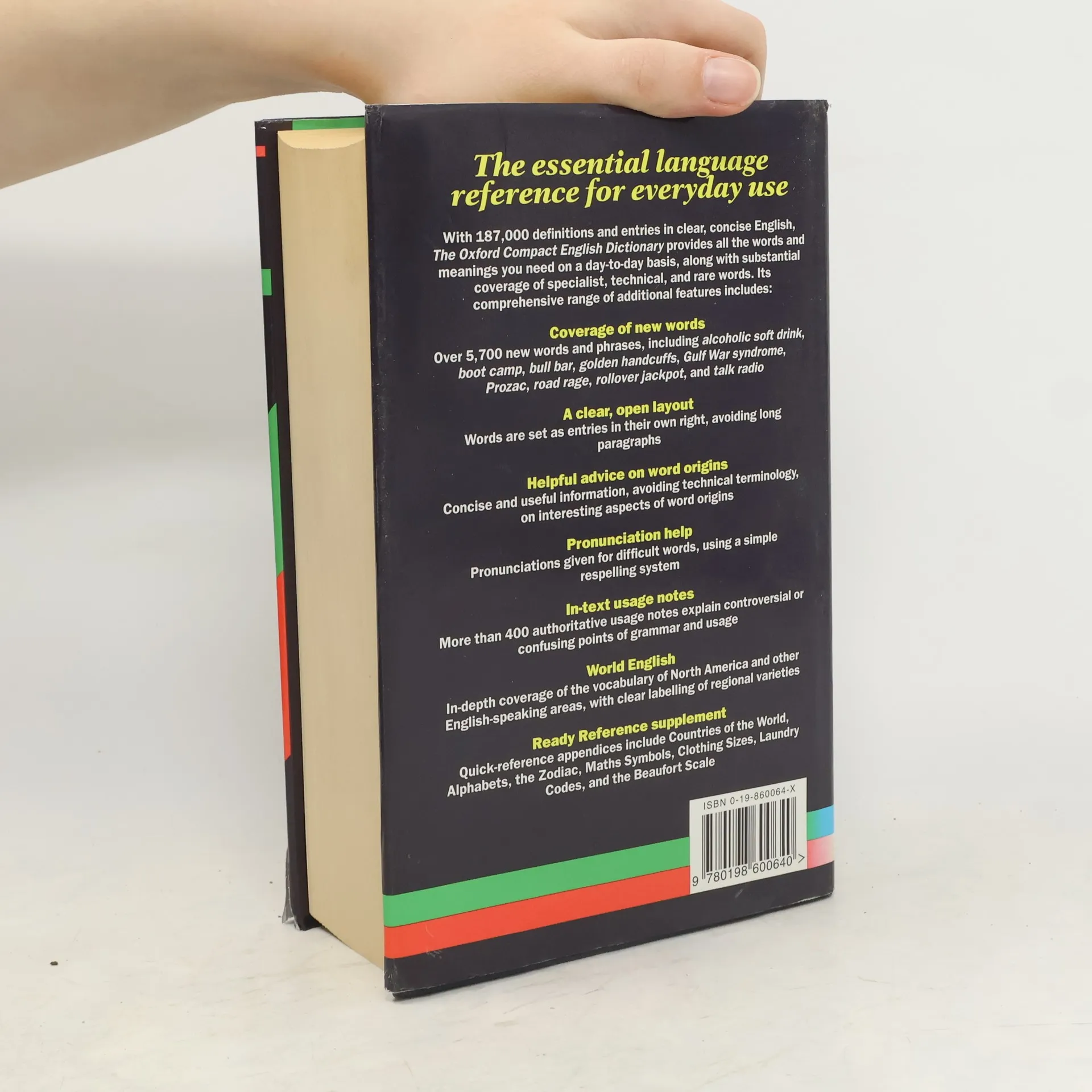"Oxford's new rapid-access page designs set most words as entries in their own right to avoid long paragraphs that hide related words. Clear margins, special typefaces, and symbols ensure exceptional clarity. Paper and binding styles are carefully selected for their durability. Jargon has been translated into plain English, and confusing abbreviations simplified or avoided." "Every definition is based on wide scrutiny of real evidence, drawn from millions of unique citations collected by The Oxford World Reading Program. In addition, Oxford lexicographers have access to a 100-million-word corpus, with rapid computer search-and-analysis techniques providing answers to the most complex language queries." "For greater clarity, the most important meaning of each word is placed first. This is followed by derived senses, technical senses, slang, idioms, and historical or obsolete senses. To help users distinguish between correct and incorrect grammar and usage, reliable guidance is provided by Language in Use panels on larger dictionaries and concise in-text notes in smaller ones."--BOOK JACKET