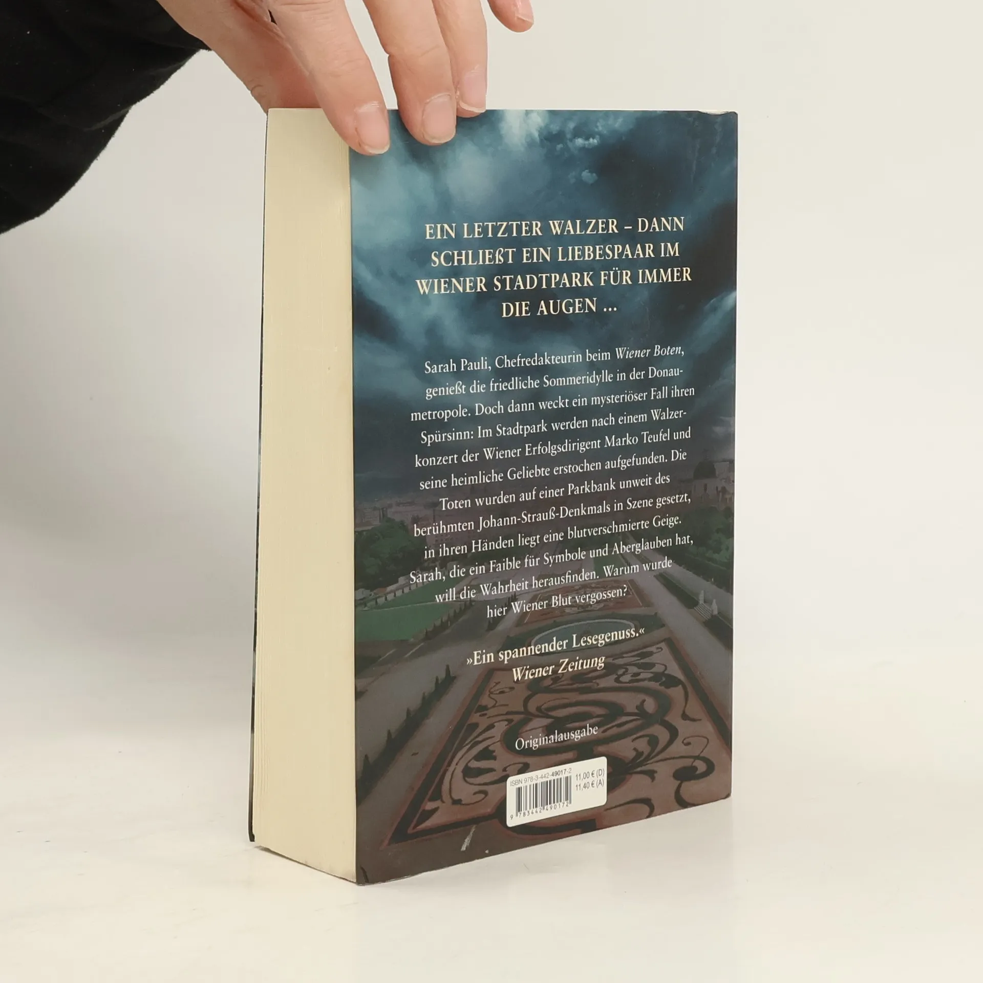 Ein letzter Walzer – dann schließt ein Liebespaar im Wiener Stadtpark für immer die Augen ... Sarah Pauli, Chefredakteurin beim Wiener Boten, genießt die friedliche Sommeridylle in der Donaumetropole. Doch dann weckt ein mysteriöser Fall ihren Spürsinn: Im Stadtpark werden nach einem Walzerkonzert der Wiener Erfolgsdirigent Marko Teufel und seine heimliche Geliebte erstochen aufgefunden. Die Toten wurden auf einer Parkbank unweit des berühmten Johann-Strauß-Denkmals in Szene gesetzt, in ihren Händen liegt eine blutverschmierte Geige. Sarah, die ein Faible für Symbole und Aberglauben hat, will die Wahrheit herausfinden. Warum wurde hier Wiener Blut vergossen?
