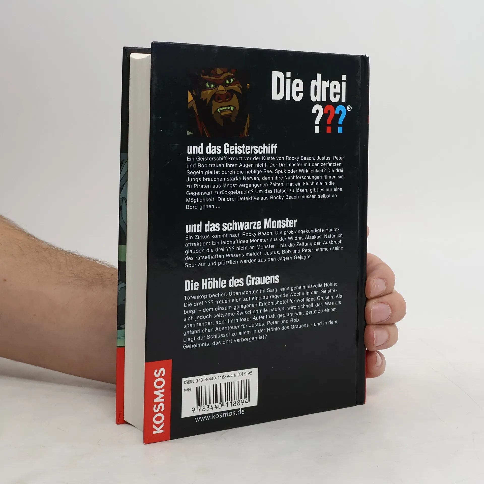 Drei spannende Fälle in einem Band! Die drei ??? und das Geisterschiff: Ein Geisterschiff kreuzt vor der Küste von Rocky Beach. Justus, Peter und Bob trauen ihren Augen nicht: Der Dreimaster mit den zerfetzten Segeln gleitet durch die neblige See. Spuk oder Wirklichkeit? Die drei Jungs brauchen starke Nerven, denn ihre Nachforschungen führen sie zu Piraten aus längst vergangenen Zeiten. Hat ein Fluch sie in die Gegenwart zurückgebracht? Um das Rätsel zu lösen, gibt es nur eine Möglichkeit: Die drei Detektive aus Rocky Beach müssen selbst an Bord gehen. Die drei ??? und das schwarze Monster: Ein Zirkus kommt nach Rocky Beach. Die groß angekündigte Hauptattraktion: Ein leibhaftiges Monster aus der Wildnis Alaskas. Natürlich glauben die drei ??? nicht an Monster - bis die Zeitung den Ausbruch des rätselhaften Wesens meldet. Justus, Bob und Peter nehmen seine Spur auf und plötzlich werden aus den Jägern Gejagte. Die drei ??? Die Höhle des Grauens: Totenkopfbecher, Übernachten im Sarg, eine geheimnisvolle Höhle: Die drei ??? freuen sich auf eine aufregende Woche in der 'Geisterburg' - dem einsam gelegenen Erlebnishotel für wohliges Gruseln. Als sich jedoch seltsame Zwischenfälle häufen, wird schnell klar: Was als spannender, aber harmloser Aufenthalt geplant war, gerät zu einem gefährlichen Abenteuer für Justus, Peter und Bob. Liegt der Schlüssel zu allem in der Höhle des Grauens - und in dem Geheimnis, das dort verborgen ist?