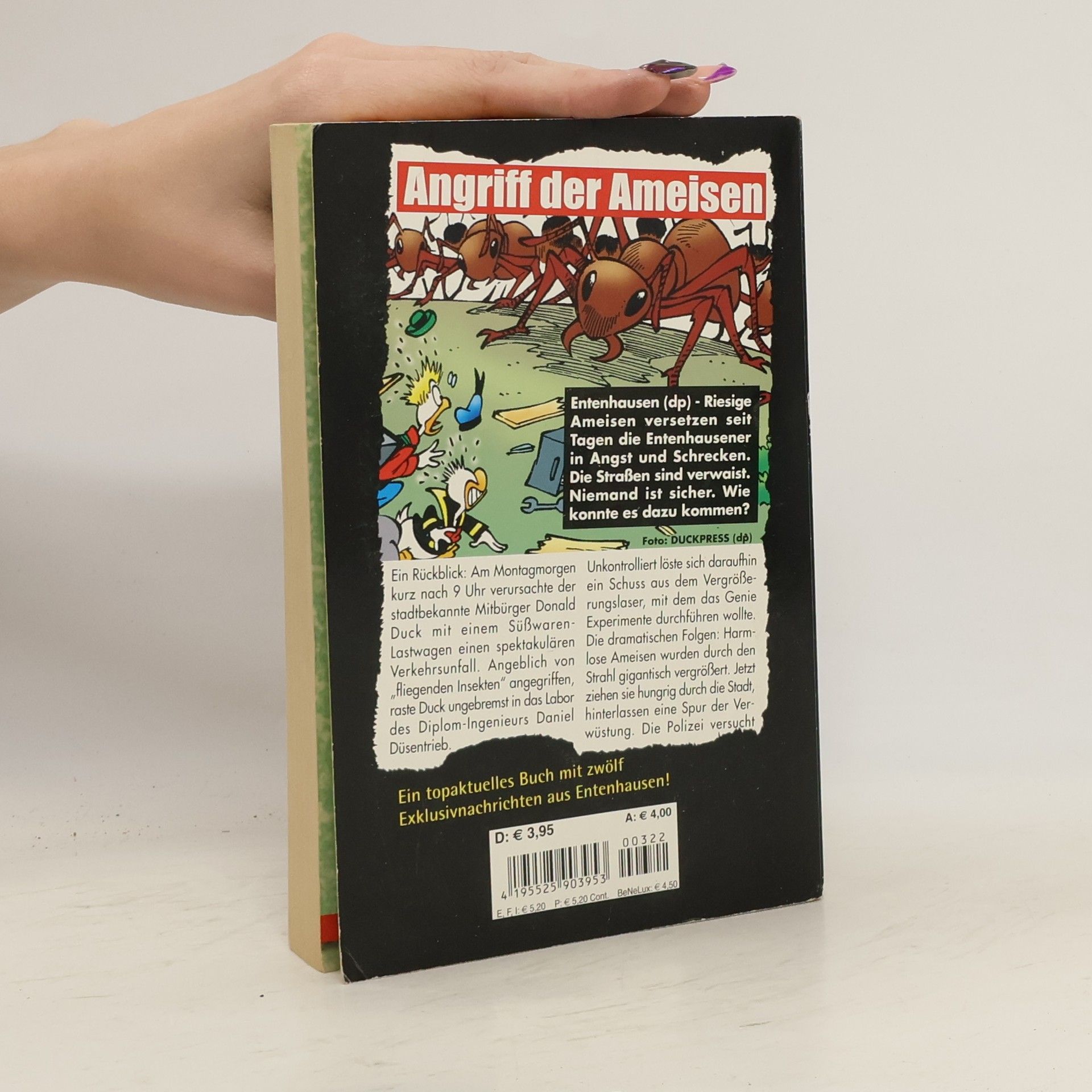 Auszug aus einem Exklusivbericht zur Lage in Entenhausen:Entenhausen (dp) - Riesige Ameisen versetzen seit Tagen die Entenhausener in Angst und Schrecken. Die Straßen sind verwaist. Niemand ist sicher. Wie konnte es dazu kommen?Ein Rückblick: Am Montagmorgen kurz nach 9 Uhr verursachte der stadtbekannte Mitbürger Donald Duck mit einem Süßwaren-Lastwagen einen spektakulären Verkehrsunfall. Angeblich von "fliegenden Insekten" angegriffen, raste Duck ungebremst in das Labor des Diplom-Ingenieurs Daniel Düsentrieb. Unkontrolliert löste sich daraufhin ein Schuss aus dem Vergrößerungslaser, mit dem das Genie Experiemente durchführen wollte. Die dramatischen Folgen: Harmlose Ameisen wurden durch den Strahl gigantisch vergrößert. Jetzt ziehen sie hungrig durch die Stadtk, hinterlassen eine Spur der Verwüstung. Die Polizei versucht...Ein topaktuelles Buch mit zwölf Exklusivnachrichten aus Entenhausen!