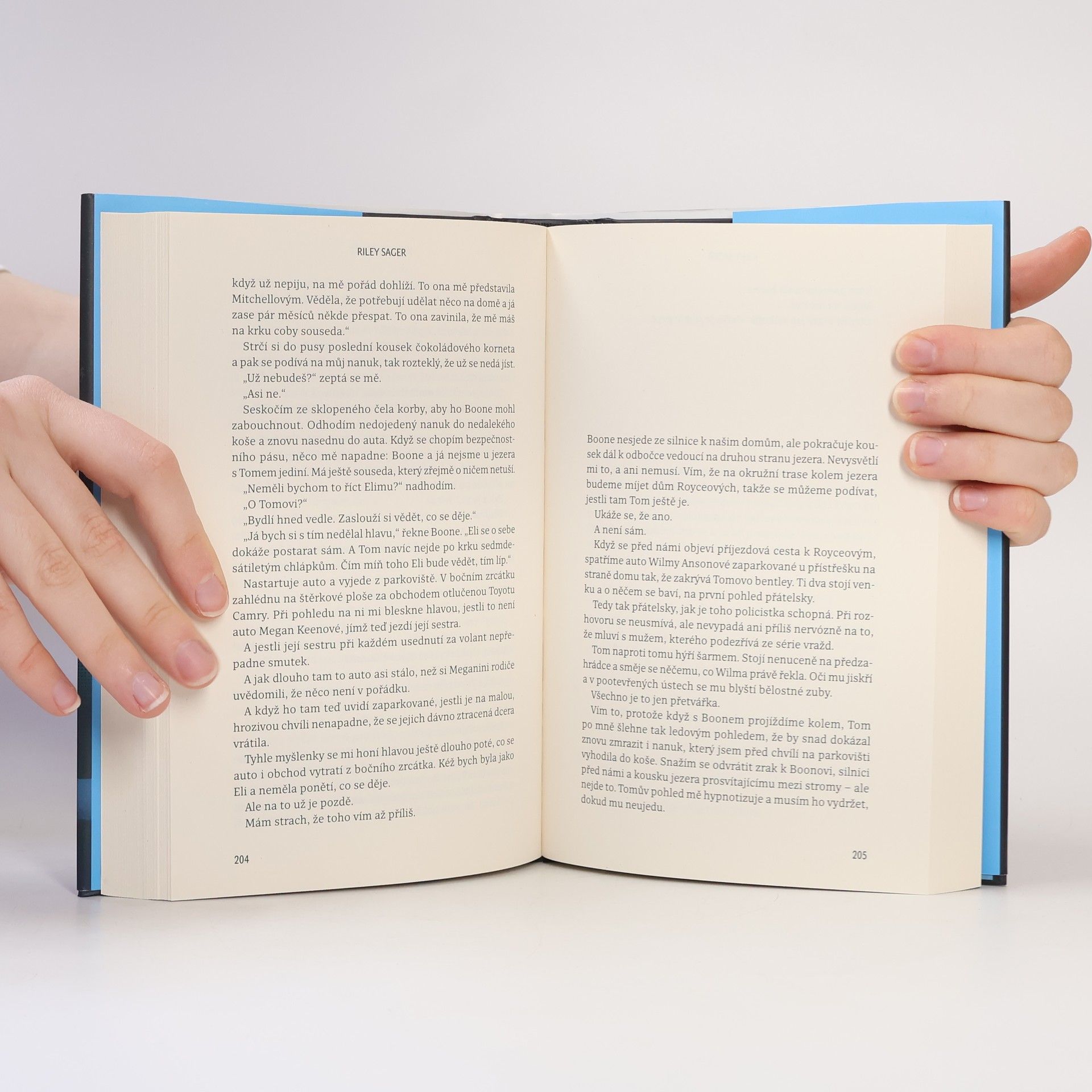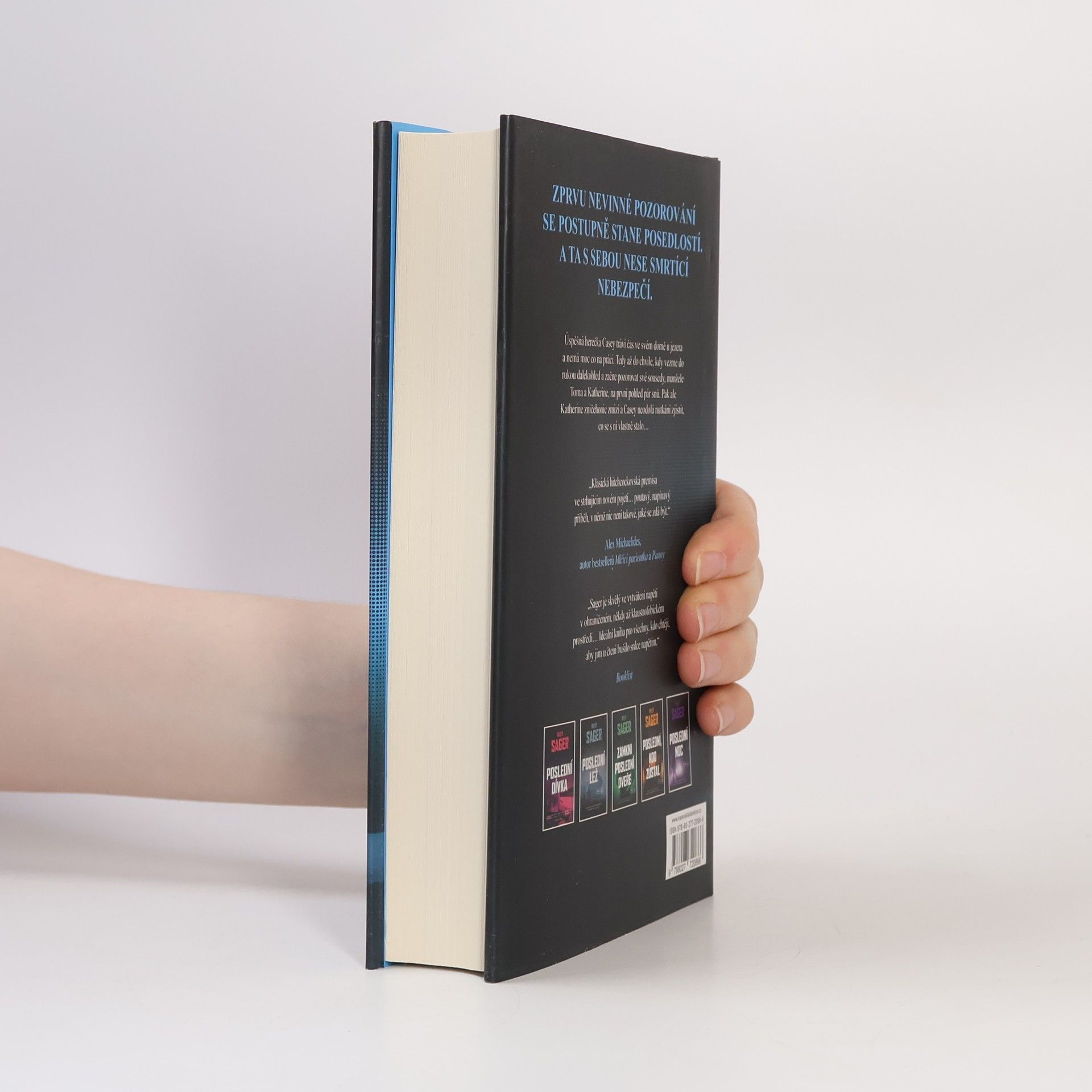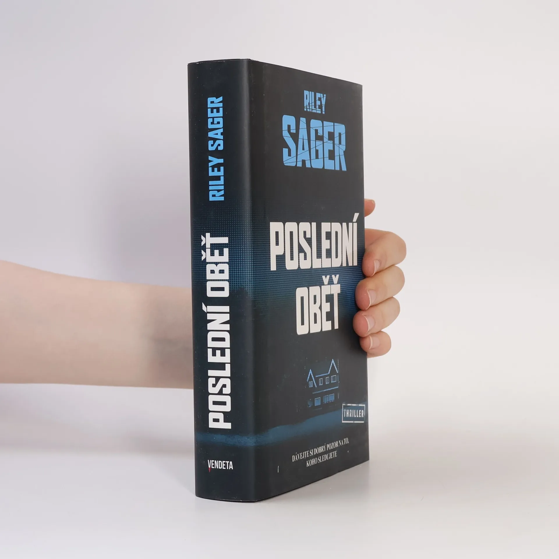 Nedávno ovdovělá herečka Casey Fletcherová se ukryla před bulvárními novináři do letního sídla u klidného jezera ve Vermontu. Vyzbrojena dalekohledem a zásobou lahví svého oblíbeného alkoholu si krátí čas pozorováním Toma a Katherine Royceových, kteří bydlí v domě na protější straně jezera. Je to nádherný pár: Tom je bohatý technologický inovátor, Katherine bývalá modelka. Jednoho dne Casey zachrání Katherine před utonutím v jezeře a vznikne mezi nimi přátelství. Čím více se však poznávají a čím déle Casey sousedy sleduje, tím je jasnější, že manželství Katherine a Toma není zdaleka tak dokonalé a klidné, jak by se mohlo zdát. Když Katherine náhle zmizí, Casey se pokouší zjistit, co se s ní stalo. Odhaluje přitom děsivé a temné pravdy, v jejichž světle se příběh o voyeurismu a podezírání mění v příběh o vině, posedlosti a o tom, jak moc může zdání klamat. Riley Sager ve své nové knize Poslední oběť namíchal typickou směsici výrazných postav, psychologického napětí a překvapivých zvratů, nad nimiž budou čtenáři žasnout až do poslední stránky.