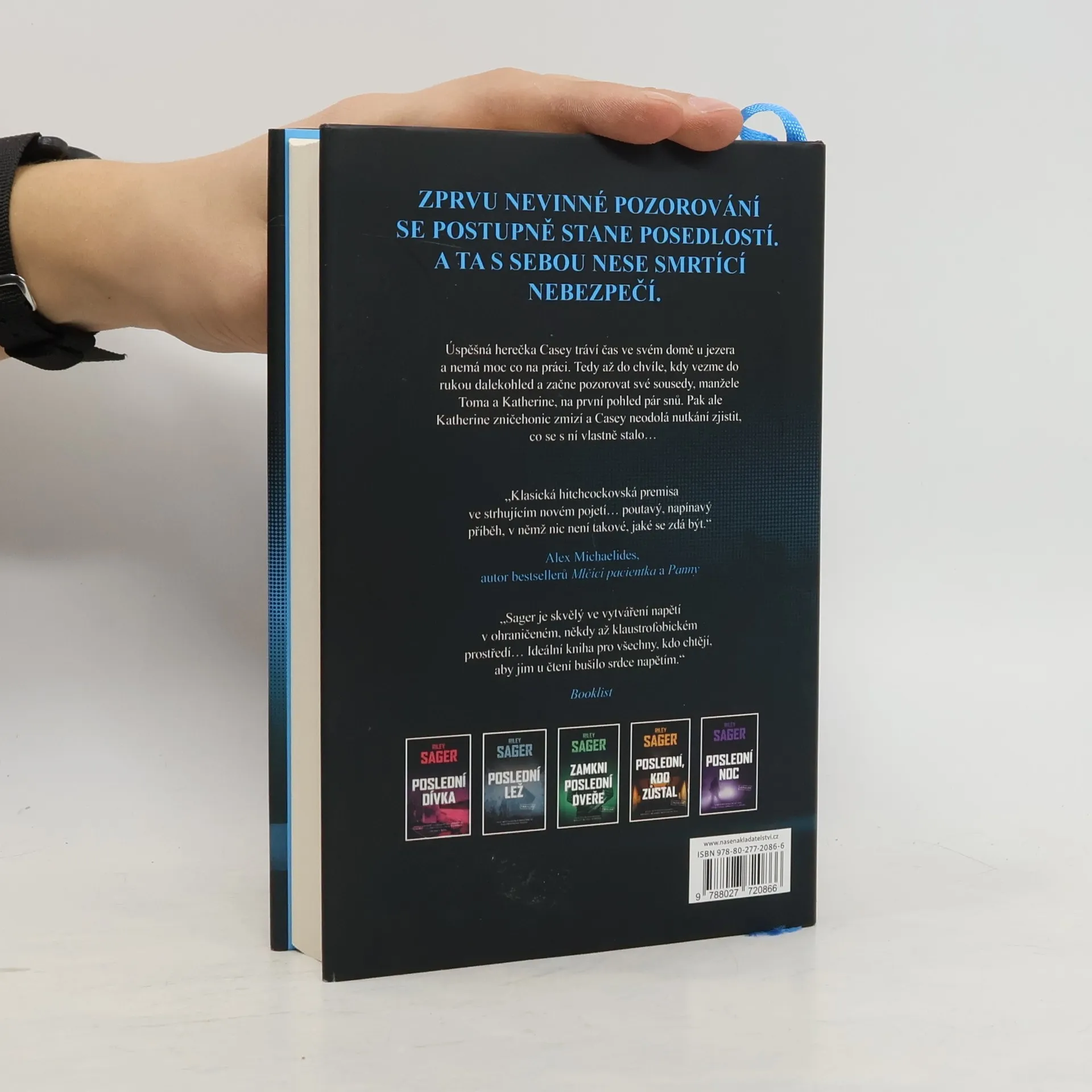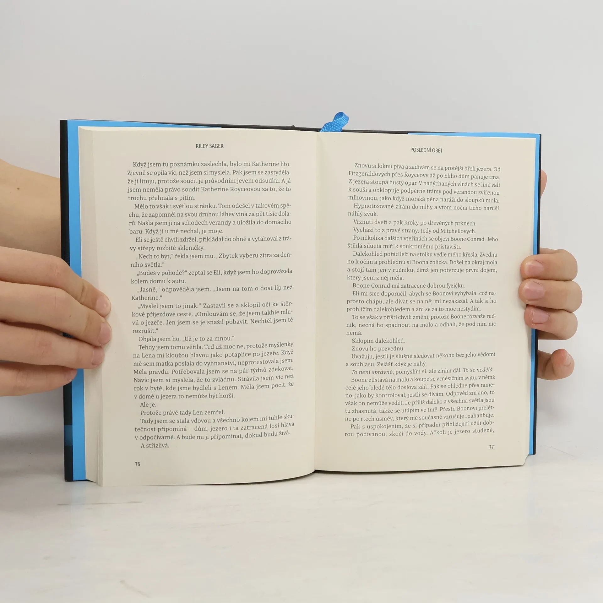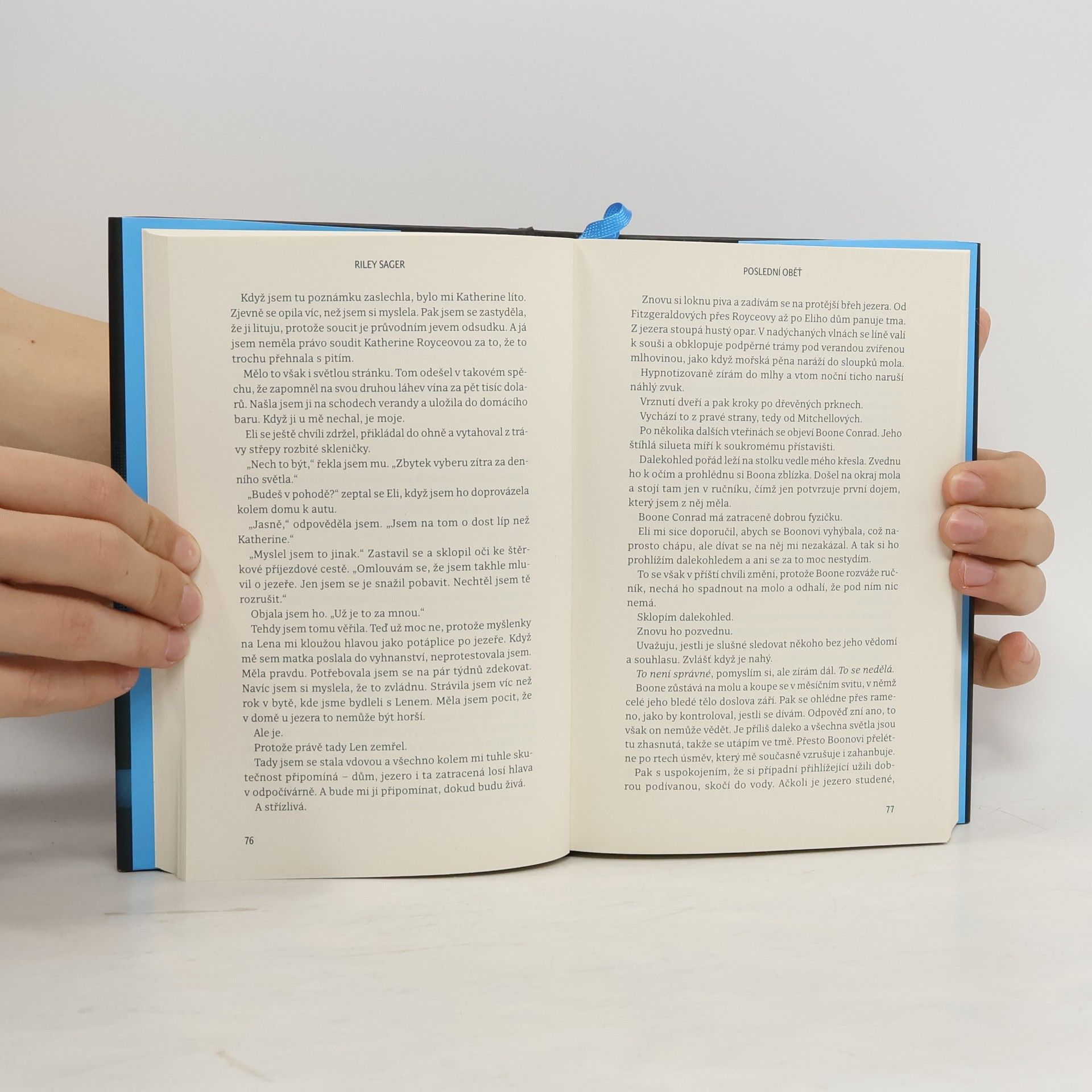 Nedávno ovdovělá herečka Casey Fletcherová se ukryla před bulvárními novináři do letního sídla u klidného jezera ve Vermontu. Vyzbrojena dalekohledem a zásobou lahví svého oblíbeného alkoholu si krátí čas pozorováním Toma a Katherine Royceových, kteří bydlí v domě na protější straně jezera. Je to nádherný pár: Tom je bohatý technologický inovátor, Katherine bývalá modelka. Jednoho dne Casey zachrání Katherine před utonutím v jezeře a vznikne mezi nimi přátelství. Čím více se však poznávají a čím déle Casey sousedy sleduje, tím je jasnější, že manželství Katherine a Toma není zdaleka tak dokonalé a klidné, jak by se mohlo zdát. Když Katherine náhle zmizí, Casey se pokouší zjistit, co se s ní stalo. Odhaluje přitom děsivé a temné pravdy, v jejichž světle se příběh o voyeurismu a podezírání mění v příběh o vině, posedlosti a o tom, jak moc může zdání klamat. Riley Sager ve své nové knize Poslední oběť namíchal typickou směsici výrazných postav, psychologického napětí a překvapivých zvratů, nad nimiž budou čtenáři žasnout až do poslední stránky.