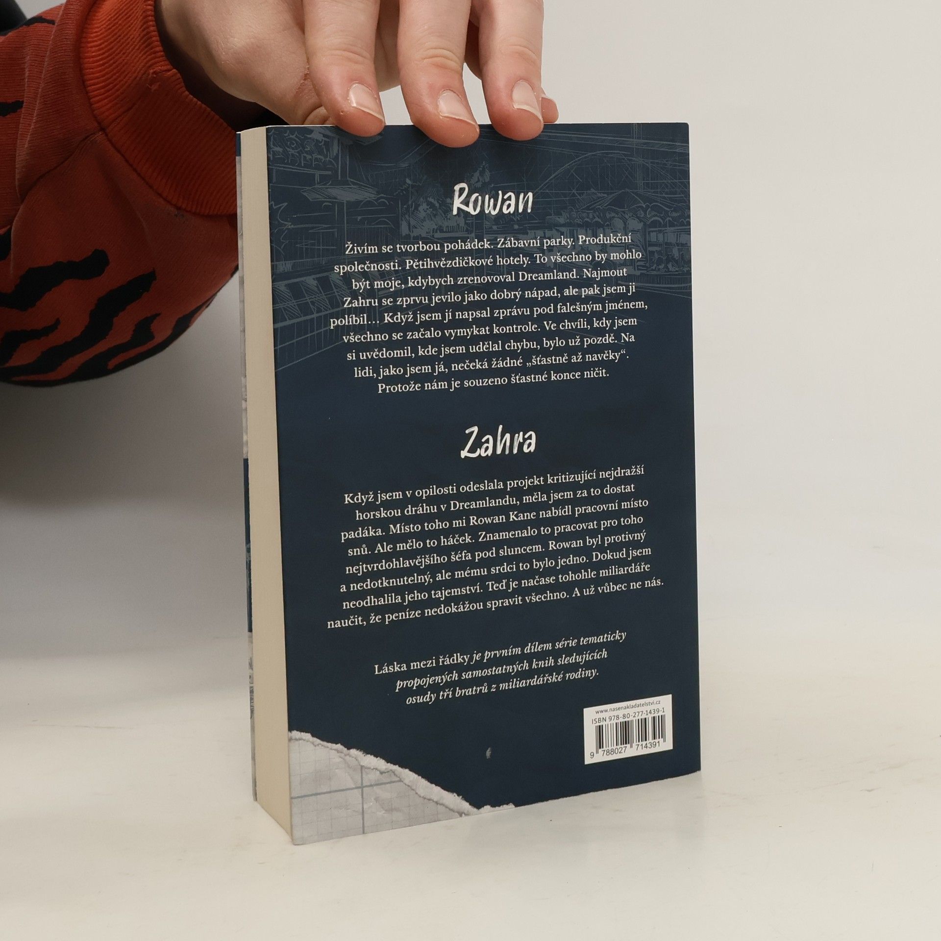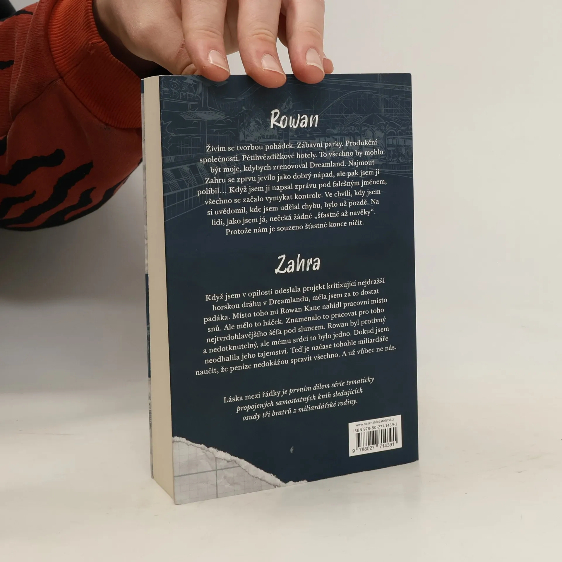 Rowan. Živím se tvorbou pohádek. Zábavní parky. Produkční společnosti. Pětihvězdičkové hotely. To všechno by mohlo být moje, kdybych zrenovoval Dreamland. Najmout Zahru se zprvu jevilo jako dobrý nápad, ale pak jsem ji políbil Když jsem jí napsal zprávu pod falešným jménem, všechno se začalo vymykat kontrole. Když jsem si uvědomil, kde jsem udělal chybu, bylo už pozdě. Na lidi, jako jsem já, nečeká žádné „šťastně až navěky“. Protože nám je souzeno šťastné konce ničit. Zahra Když jsem v opilosti odeslala projekt kritizující nejdražší horskou dráhu v Dreamlandu, měla jsem za to dostat padáka. Místo toho mi Rowan Kane nabídl pracovní místo snů. Ale mělo to háček. Znamenalo to pracovat pro toho nejtvrdohlavějšího šéfa pod sluncem. Rowan byl protivný a nedotknutelný, ale mému srdci to bylo jedno. Dokud jsem neodhalila jeho tajemství. Teď je načase tohohle miliardáře naučit, že peníze nedokážou spravit všechno. A už vůbec ne nás. Láska mezi řádky je prvním dílem série tematicky propojených samostatných knih sledujících osudy tří bratrů z miliardářské rodiny.